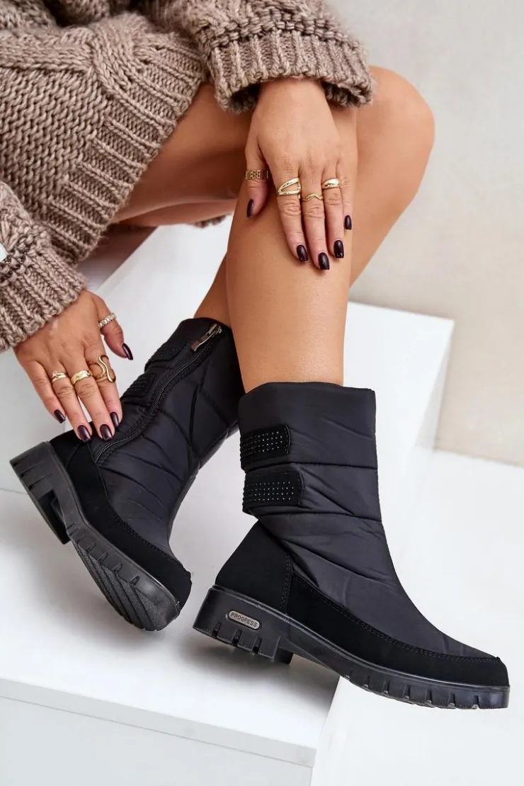 Lekkie i wygodne śniegowce damskie. Osadzone na płaskim obcasie. Zapinane na zamek. Ocieplane grubym futerkiem wewnątrz, doskonale ochroni przed zimnem, zapewniając ciepło nawet w najchłodniejsze dni. Świetnie sprawdzą się podczas codziennego użytkowania w zimowe dni. Przy wyborze rozmiaru, prosimy sugerować się tabelą rozmiarów.
