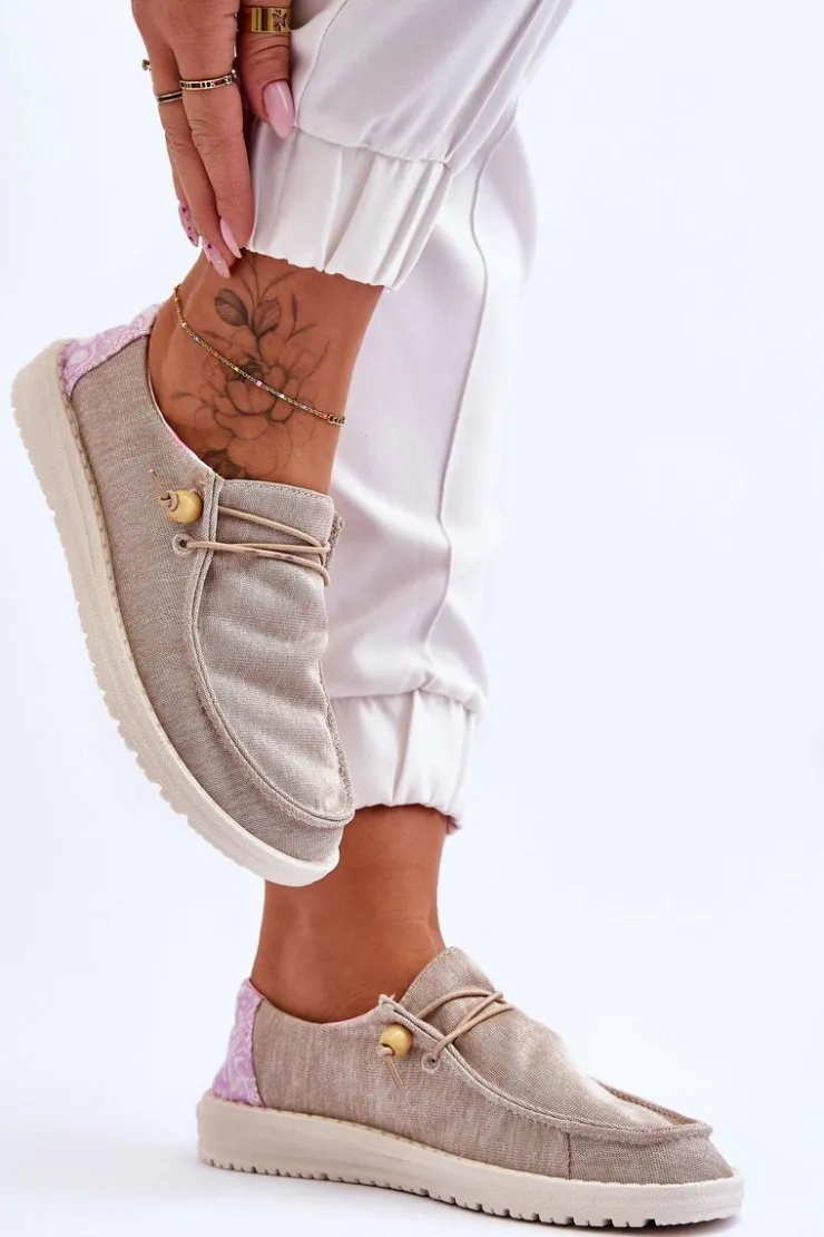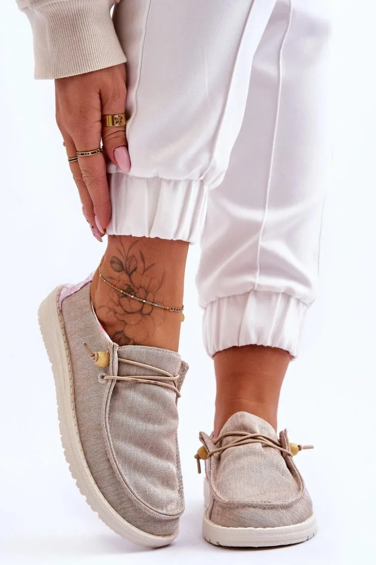 Wsuwane tenisówki damskie zostały wykonane z materiału tekstylnego z ozdobnym tyłem cholewki. Model wsuwany z gumkami imitującymi sznurowadła. Trampki zostały osadzone na delikatnej platformie z tworzywa sztucznego. Wkładka w tym obuwiu jest wykonana z pianki. Przy wyborze rozmiaru prosimy sugerować się tabelą rozmiarów.