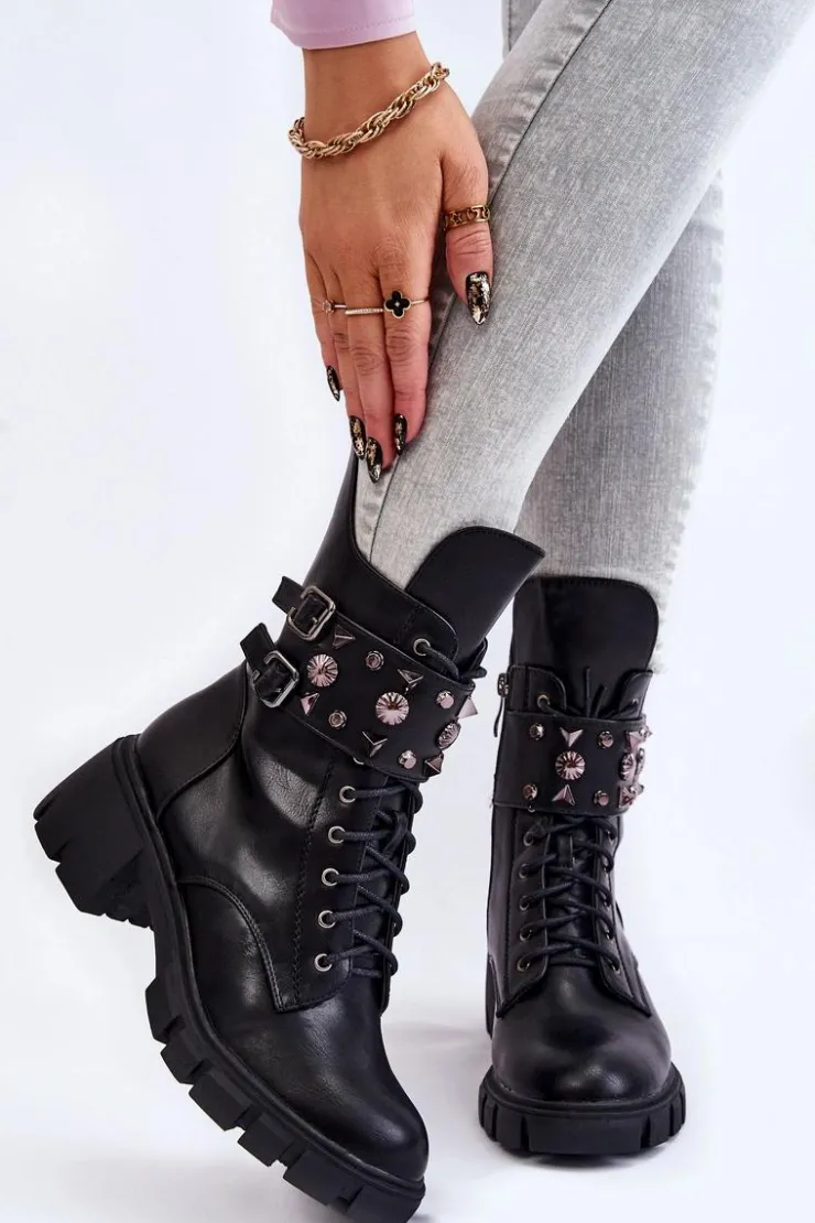 Damskie botki zostały wykonane z eko skóry. Buty zapinane na suwak oraz sznurowane. Klasyczny model został osadzony na płaskim obcasie i platformie. Botki te nie posiadają ocieplenia. Dodatkowo zostały ozdobione ćwiekami na pasku z klamrami. Zapiętek jest usztywniany. Koniecznie powinnaś je mieć w swojej szafie! Przy wyborze rozmiaru prosimy sugerować się tabelą rozmiarów.