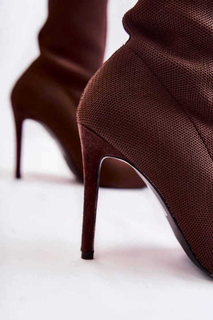 Botki posiadają modną, skarpetkową cholewkę za kostkę. Osadzone na obcasie typu szpilka. Nosek w szpic świetnie wysmukli stopę. Model wsuwany. Wykonane z elastycznego materiału, który idealnie dopasuje się do nogi. Wkładka z eko skóry. Buty posiadają usztywniany zapiętek. Idealne buty do jeansów czy dłuższych, koszulowych sukienek.Przy wyborze rozmiaru prosimy sugerować się tabelą rozmiarów.