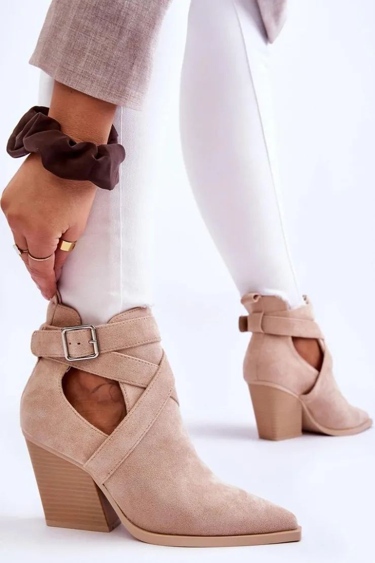 Botki o fasonie kowbojek zostały wykonane z miękkiego eko zamszu. Dodatkowo posiadają usztywniany zapiętek. Buty zostały osadzone na obcasie w postaci słupka. Cholewka z wycięciami po bokach jest charakterystyczna dla tego modelu. Te botki będą świetnym uzupełnieniem wielu stylizacji. Przy wyborze rozmiaru prosimy sugerować się tabelą rozmiarów.