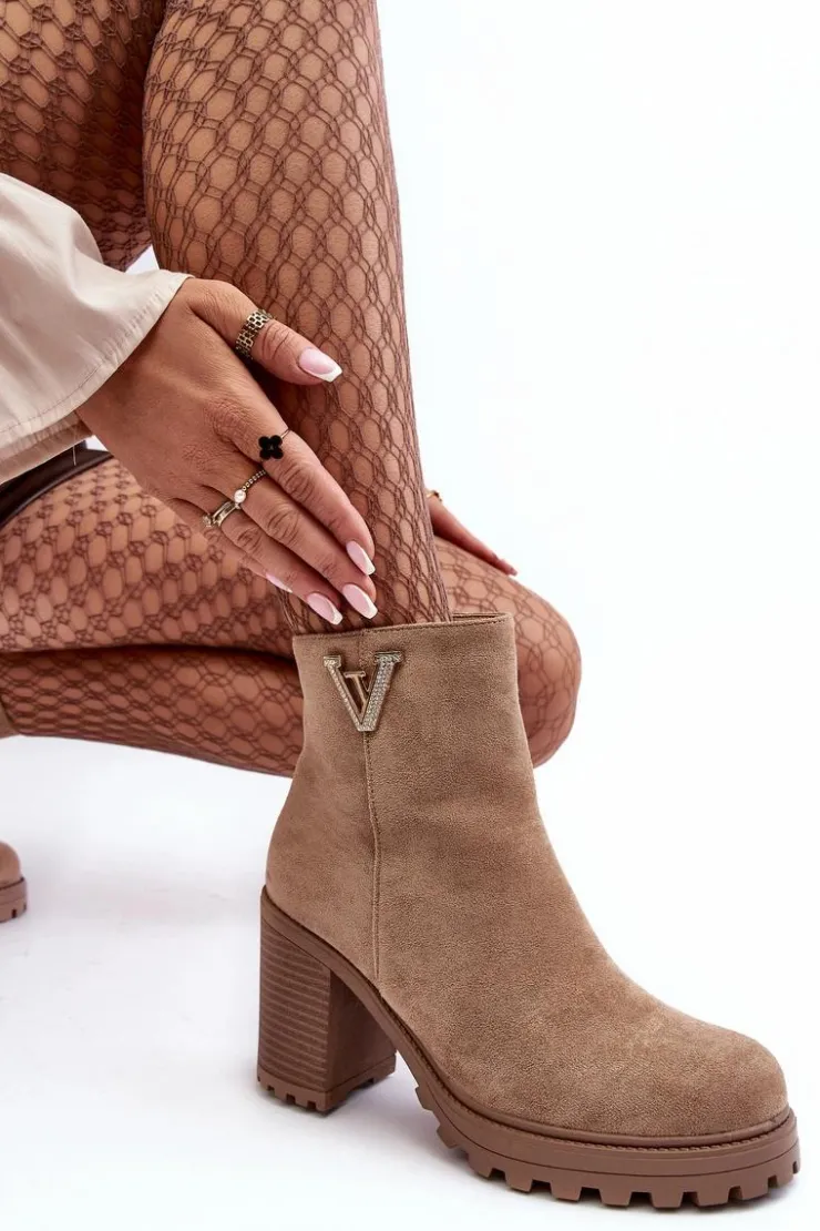 Botki damskie osadzone na obcasie w postaci słupka oraz platformie. Zostały wykonane z eko zamszu. Na cholewce z boku umieszczono ozdobę w postaci litery z dżetami. Środek nie jest ocieplony. Usztywniony zapiętek zapewni stabilizację. Model ten będzie idealnym uzupełnieniem jesienno-zimowych stylizacji! Przy wyborze rozmiaru prosimy sugerować się tabelą rozmiarów.