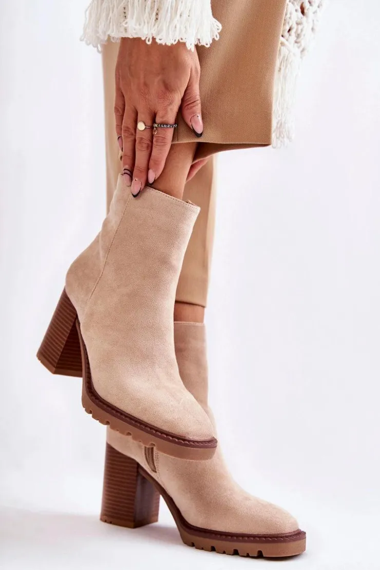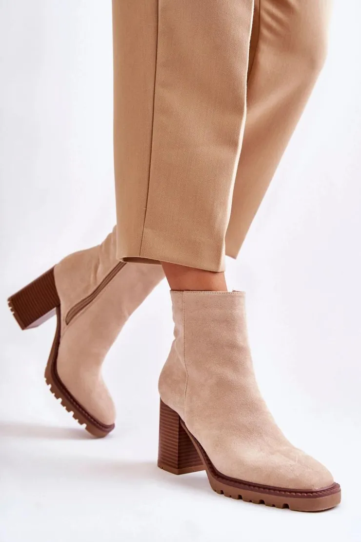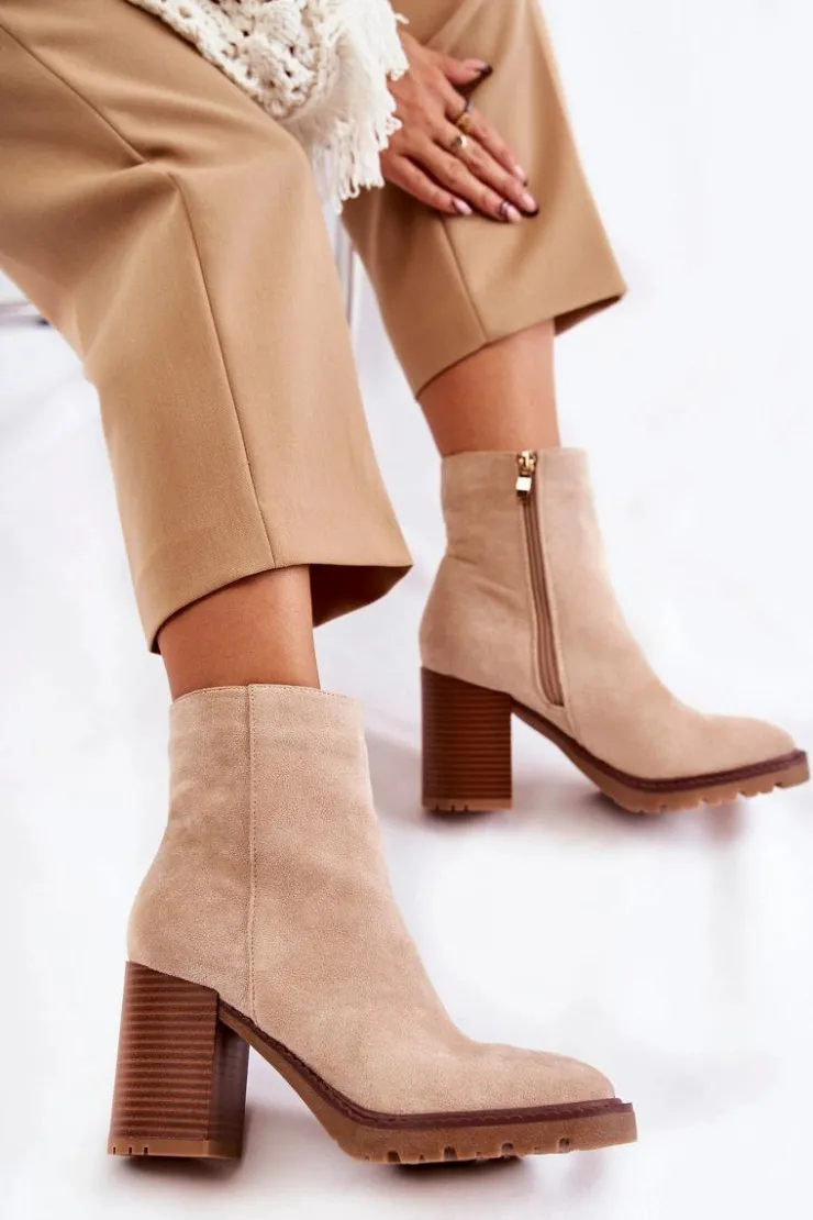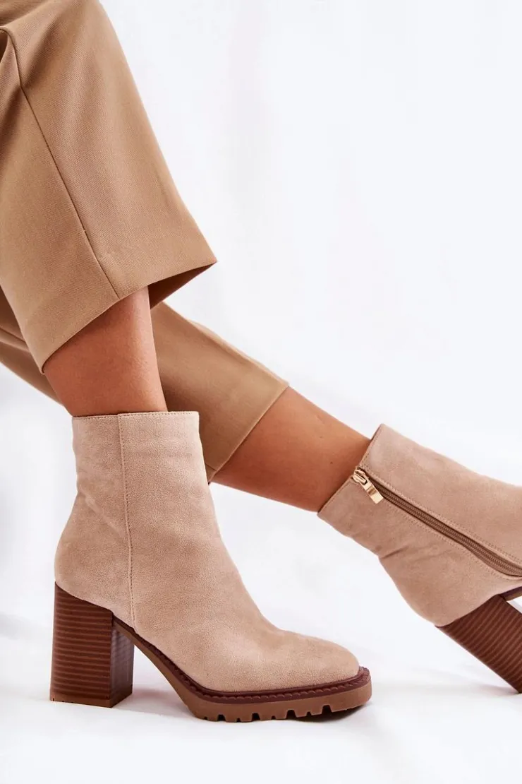 Świetne botki wykonane z miłego w dotyku eko zamszu. Model osadzony na delikatnej platformie i obcasie w postaci słupka. Buty te posiadają lekko kwadratowy nosek oraz usztywniany zapiętek. Cholewka za kostkę posiada suwak ułatwiający zakładanie obuwia. Model wygodny i stabilny. Świetnie będą komponować się plisowanymi spódnicami. Przy wyborze rozmiaru prosimy sugerować się tabelą rozmiarów.