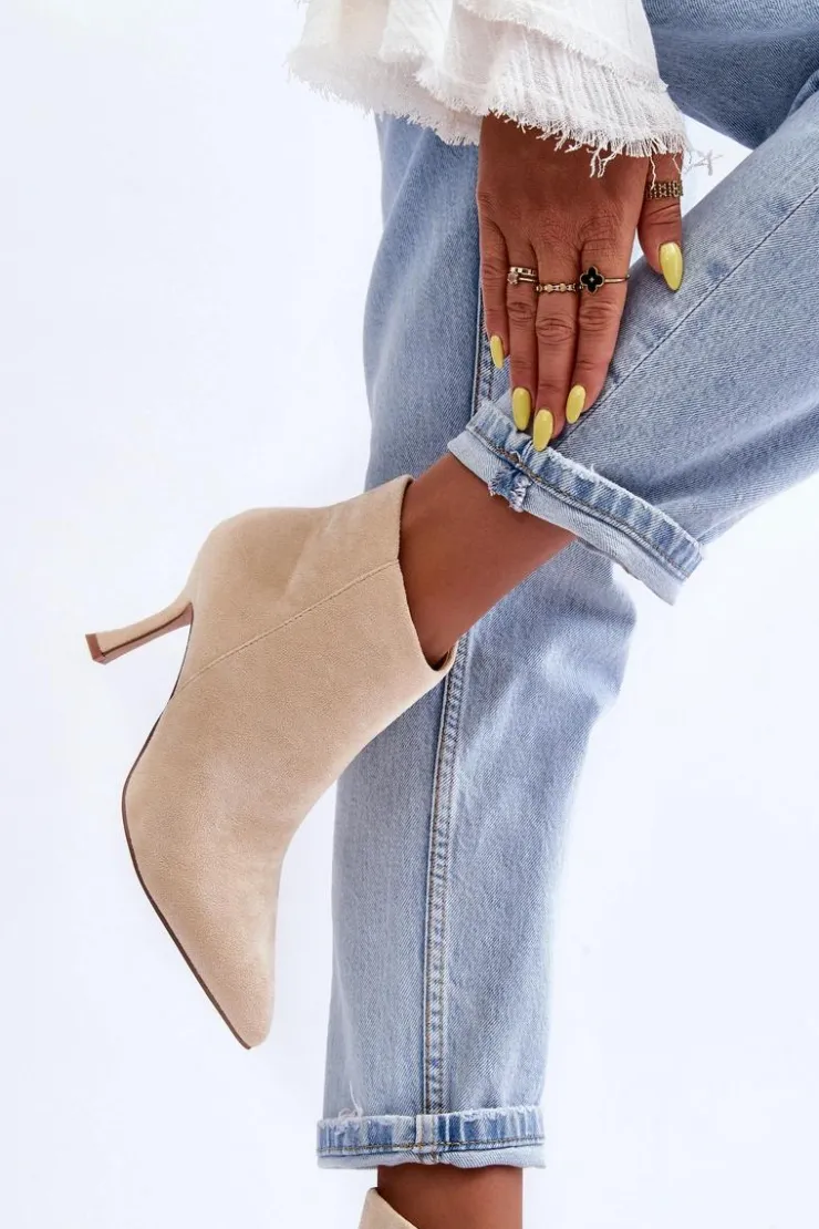 Eleganckie botki damskie zostały wykonane z eko zamszu. Model osadzony na obcasie w postaci szpilki, z noskiem w szpic świetnie wysmukli nogi. Botki są zapinane z boku na suwak. Zapiętek w tych botkach jest usztywniany. Model ten świetnie sprawdzi się w wielu stylizacjach np.: do sukienek, spódnic czy spodni. Te botki koniecznie powinny znaleźć się w Twojej szafie! Przy wyborze rozmiaru prosimy sugerować się tabelą rozmiarów.