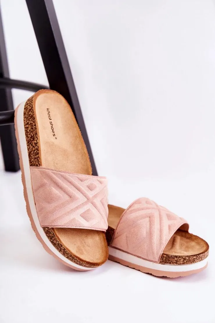 Modne klapki damskie wykonane z miłego w dotyku eko zamszu. Model osadzone na masywnej korkowej platformie z podeszwą z tworzywa sztucznego. Wkładka jest profilowana i także wykonana z eko zamszu, która zapewni komfort podczas użytkowania. Model z odkrytym noskiem. Świetny fason na upalne dni, który powinnaś mieć w swojej szafie! Przy wyborze rozmiaru prosimy sugerować się tabelą rozmiarów.