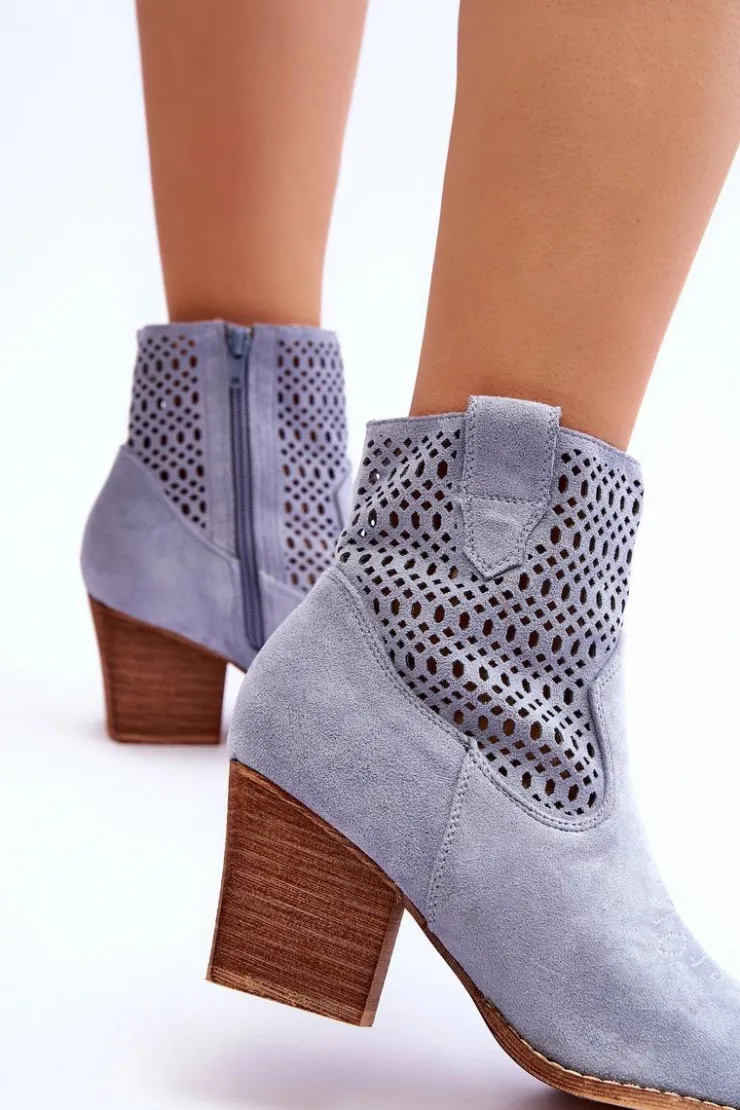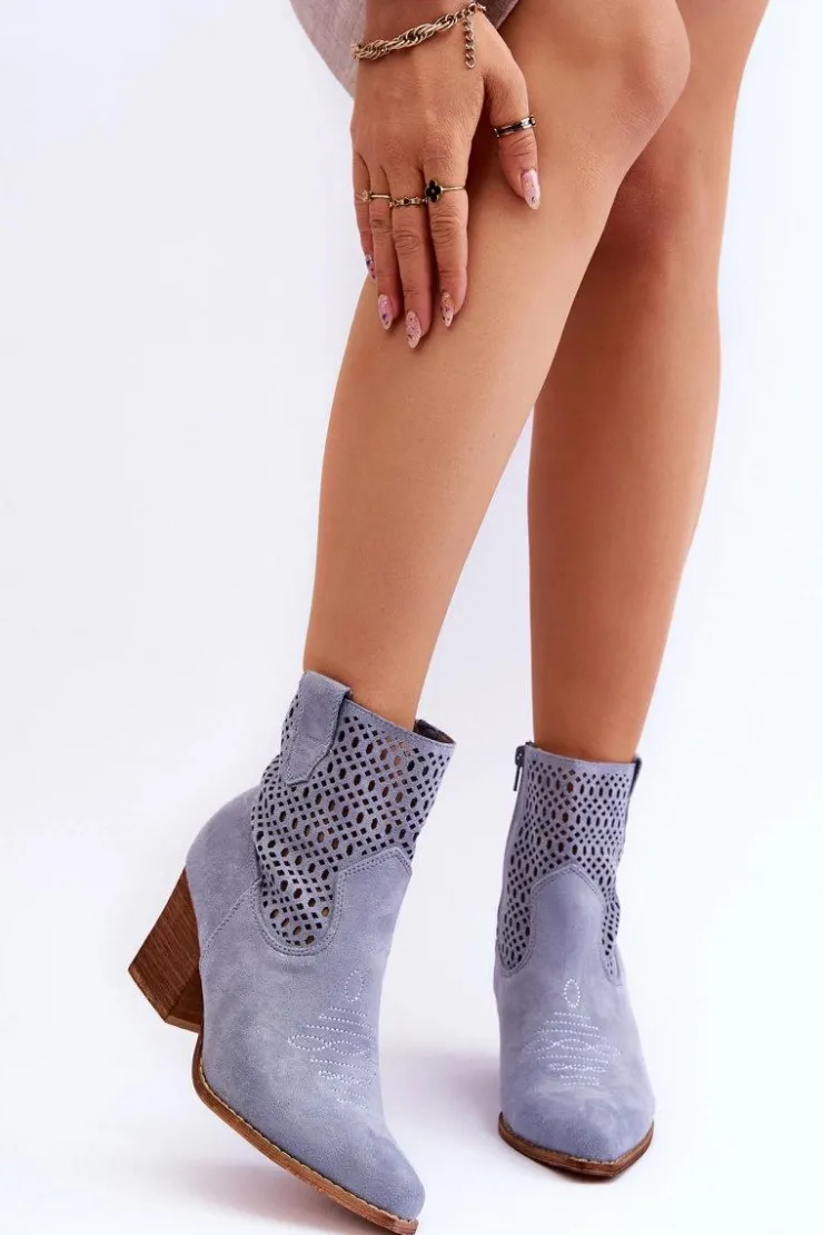Wyjątkowe botki w stylu kowbojskim z cholewką za kostkę. Botki wykonane zostały z ekologicznego zamszu z ażurowym wzorem i przeszyciem na przodzie. Materiałowa wkładka oraz stabilny obcas w postaci słupka zadbają o Twój komfort. Botki z pewnością dopełnią wiele Twoich stylizacji. Koniecznie sprawdź całą naszą kolekcję kowbojek! Przy wyborze rozmiaru prosimy sugerować się tabelą rozmiarów.