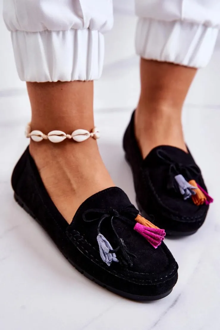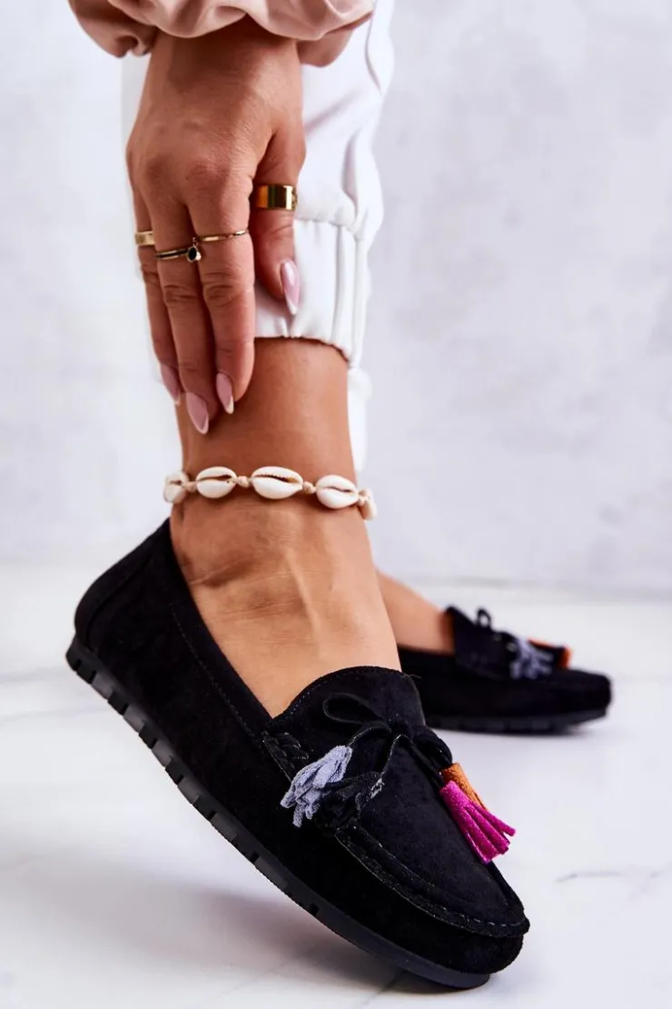 Świetne mokasyny damskie na ciepłe, pogodne dni! Wykonane z przyjemnego w dotyku eko zamszu. Posiadają usztywniany zapiętek. Z przodu znajdują się ozdobne, eko zamszowe frędzle wraz z kokardą. Nosek zakryty, okrągły. Buty posiadają miękką, perforowaną wkładkę, która została wykonana ze skóry. Mokasyny posiadają elastyczną, wykonaną z gumowego tworzywa podeszwę. Idealne do pracy czy na weekendowy wyjazd ze znajomymi. Model o uniwersalnym fasonie, z którym skomponujesz wiele stylizacji! Przy wyborze rozmiaru prosimy sugerować się tabelą rozmiarów.