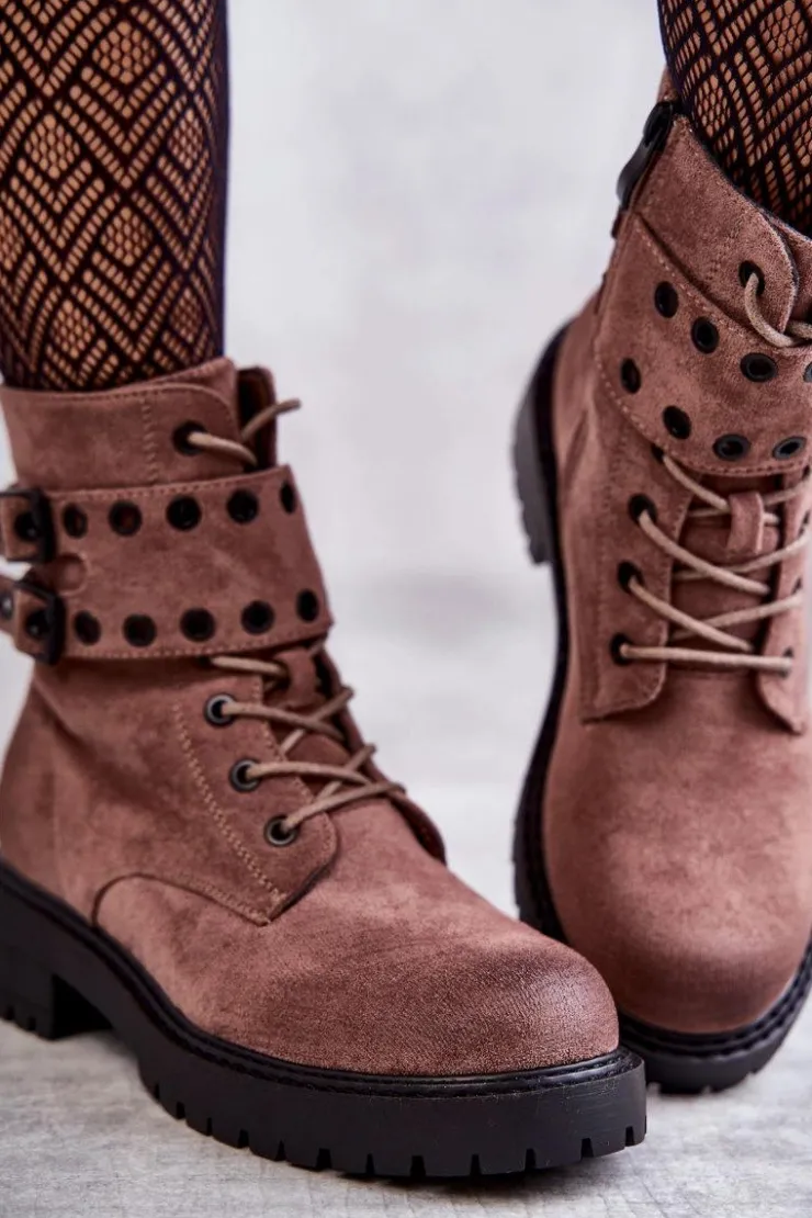 Wyjątkowe botki damskie zostały wykonane z eko zamszu z przecieranym noskiem i piętą. Posiadają suwak na boku cholewki, sznurowanie oraz modne klamry. W środku znajduje się ocieplenie w postaci koca obuwniczego. Buty dodatkowo posiadają usztywniany zapiętek. Świetny model na co dzień do pracy czy na spotkania z przyjaciółmi. Przy wyborze rozmiaru prosimy sugerować się tabelą rozmiarów.