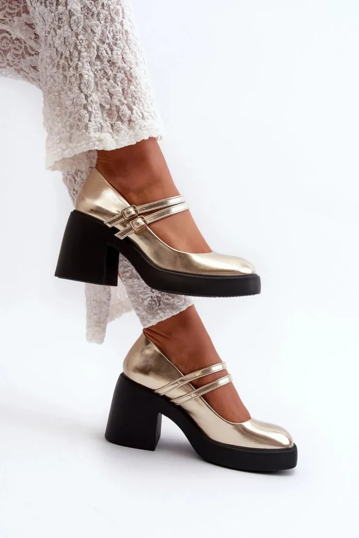 Czółenka wykonane ze skóry ekologicznej. Zapinane na dwa regulowane, cienkie, paseczki. Osadzone na masywnym, wyższym obcasie w postaci klocka. Zapiętek jest usztywniany, a nosek kwadratowy. Dodatkowo buty posiadają delikatną platformę. Ten modny fason koniecznie musi być Twój! Przy wyborze rozmiaru prosimy sugerować się tabelą rozmiarów.