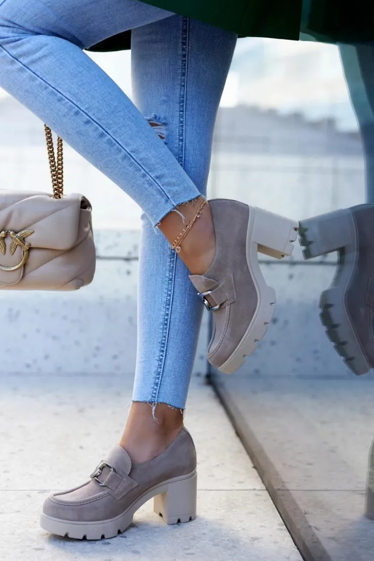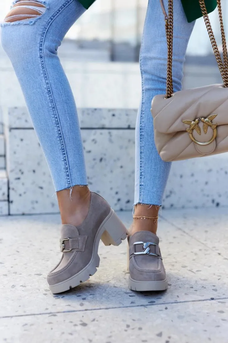 Cudowne półbuty na obcasie z cholewką wykonaną ze skóry naturalnej zamszowej. Wnętrze zostało pokryte skórą naturalną oraz materiałem tekstylnym, dzięki temu są bardzo komfortowe w użytkowaniu. Wkładka ze skóry naturalnej, a podeszwa wykonana z gumowego tworzywa. Stylowy obcas w postaci szerokiego słupka zapewni stabilizację na każdym kroku. Lustrzana ozdoba na przodzie. Zapiętek jest usztywniany. Dodatkowo pod językiem znajduje się gumka ściągająca, która sprawi, że but będzie idealnie dopasowany do stopy. Przy wyborze rozmiaru prosimy sugerować się tabelą rozmiarów.