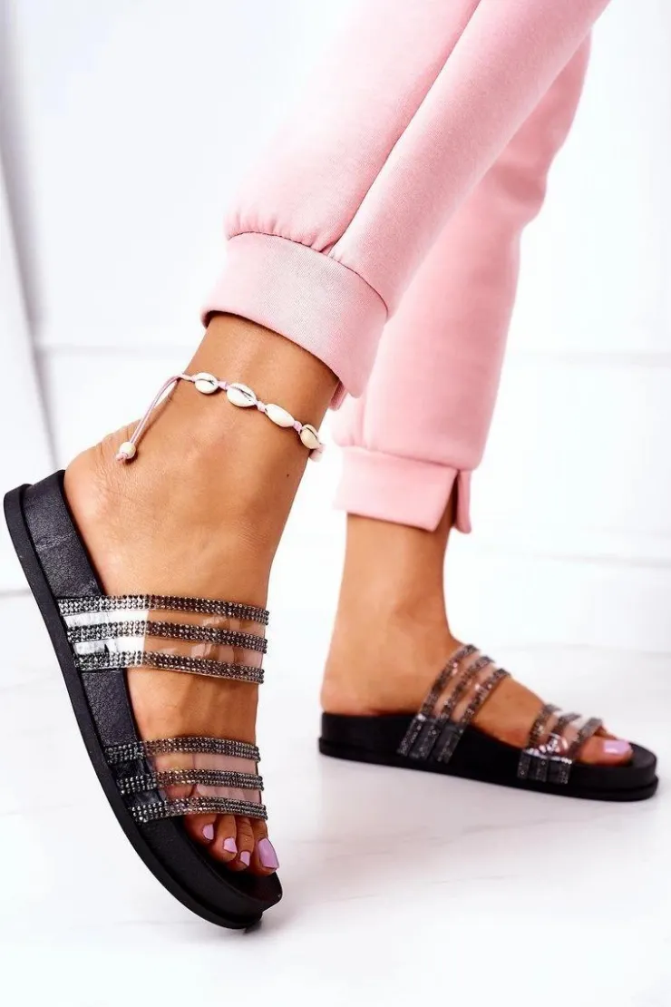 Gumowe klapki damskie ozdobione cyrkoniami. Klapki wykonane są z lekkiego gumowego tworzywa.Przy wyborze rozmiaru prosimy sugerować się tabelą rozmiarów.