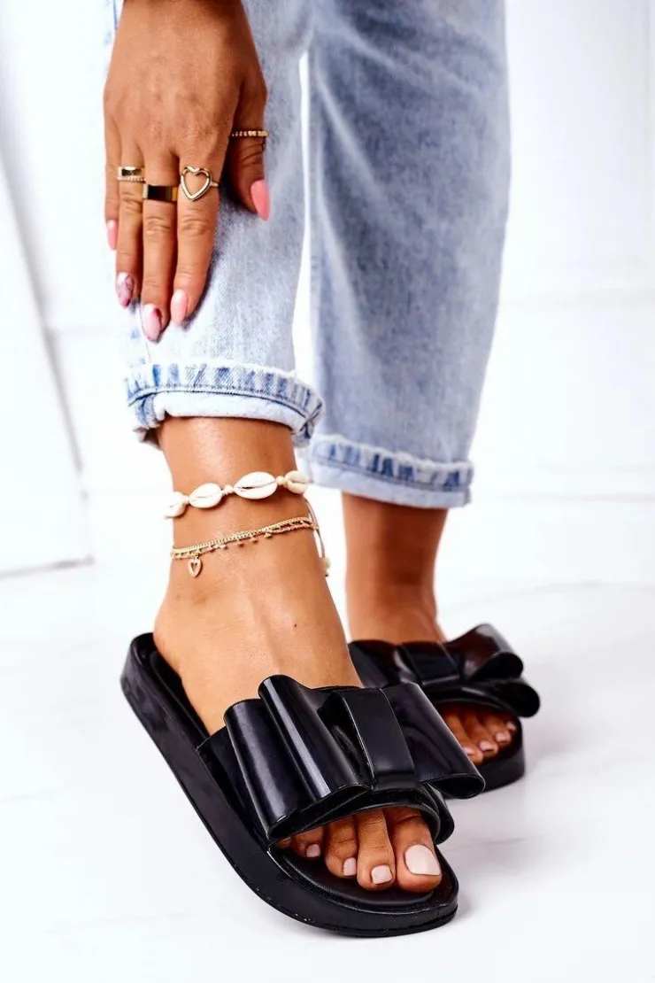 Gumowe klapki damskie z kokardą. Buty posiadają miękką wkładkę ze skóry ekologicznej. Przy wyborze rozmiaru prosimy sugerować się tabelą rozmiarów. 2 Gatunek. Na łączeniu podeszwy widoczny jest klej.