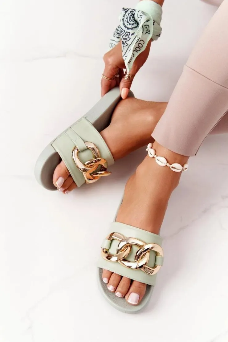 Gumowe klapki damskie z ozdobnym łańcuchem. Cholewka wykonana jest z eko skóry. Koniecznie sprawdź całą naszą kolekcję klapek damskich! Przy wyborze rozmiaru prosimy sugerować się tabelą rozmiarów.