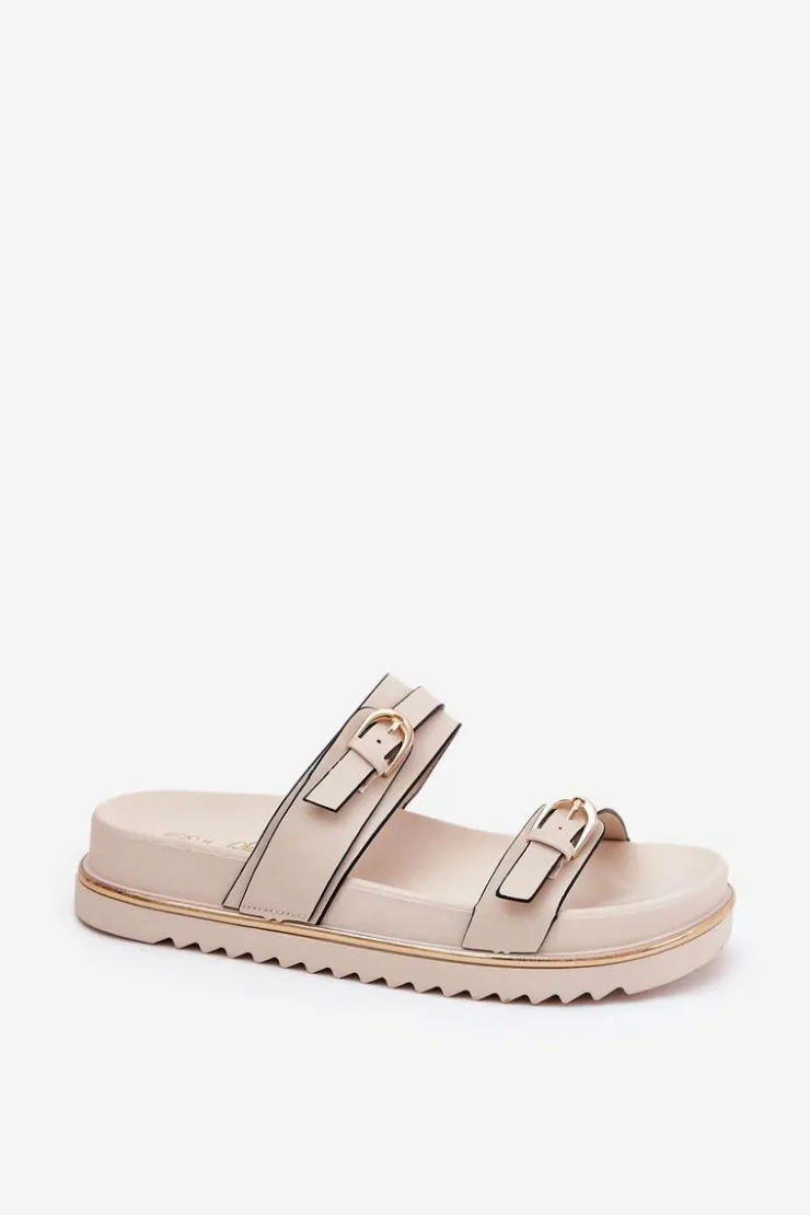 Modne klapki damskie na platformie, które łączą wygodę z nowoczesnym wyglądem. Z przodu znajdują się dwa paski z klamrami, które dodają charakteru i subtelnie przyciągają uwagę. Platforma zapewnia pewność kroku i stabilność przez cały dzień. Idealne na co dzień, doskonale pasują zarówno do sukienek, jak i spodni, tworząc uniwersalny element każdej letniej stylizacji. Przy wyborze rozmiaru rosimy sugerować się tabelą rozmiarów.