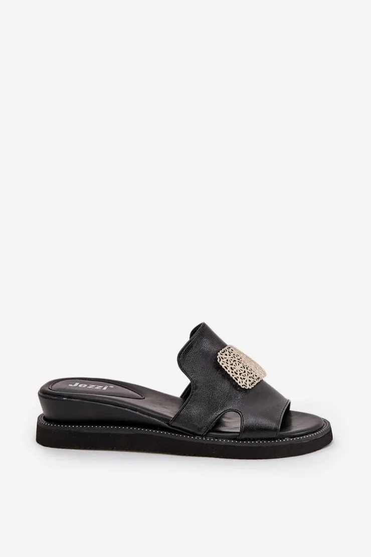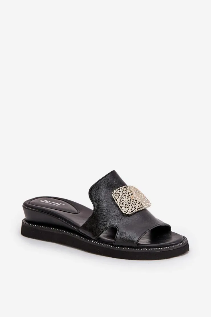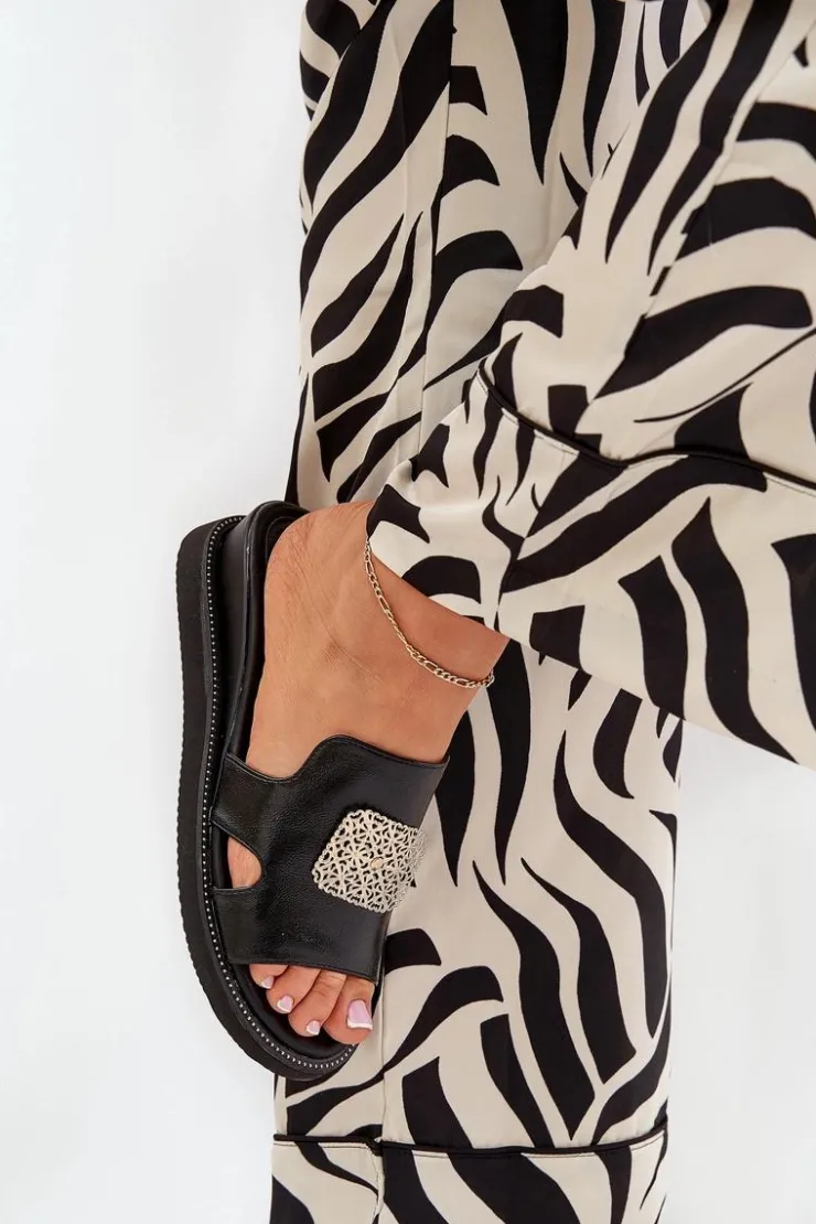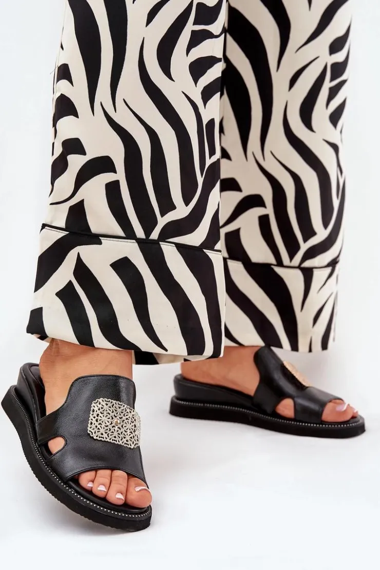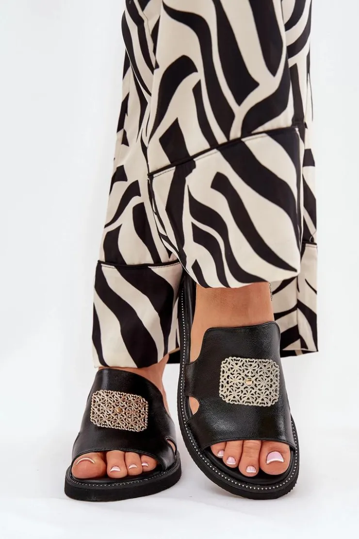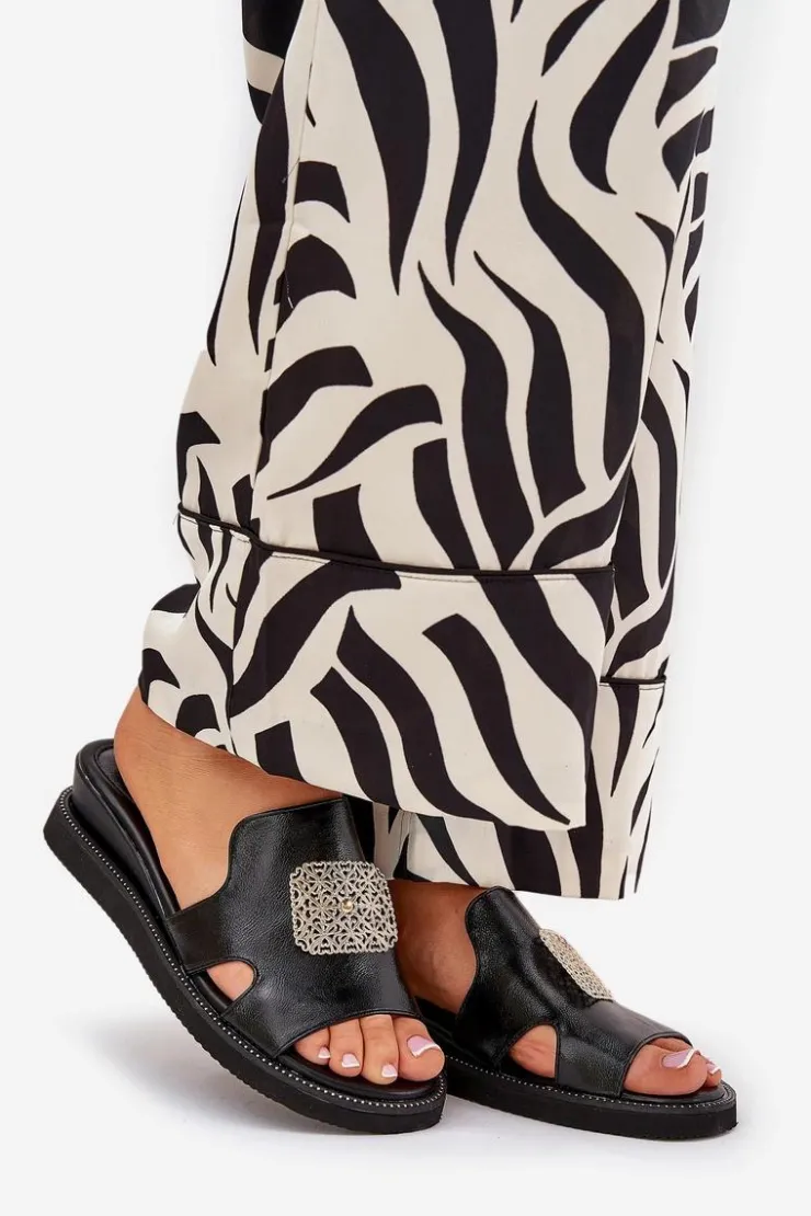 Damskie Boto Klapki Damskie Na Koturnie Eko Skórzane Z Ozdobą Czarne Sarela