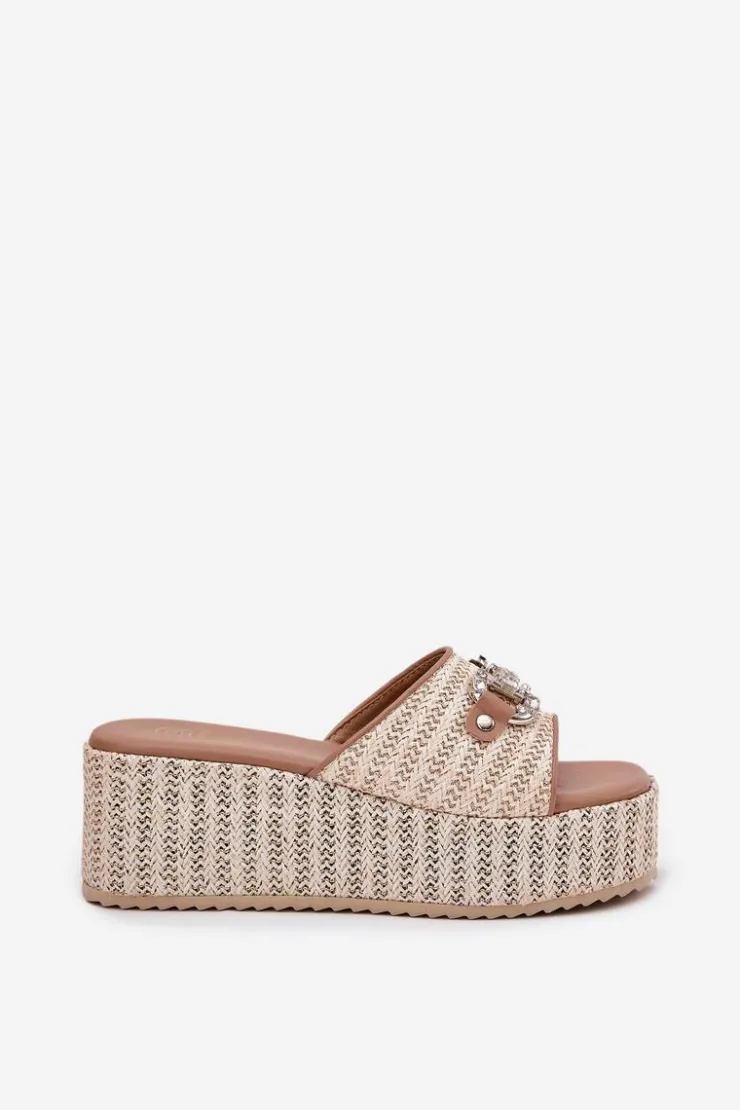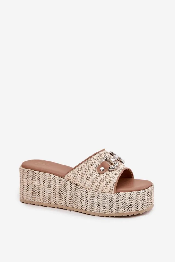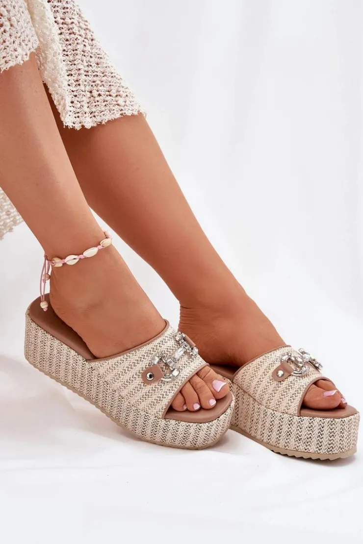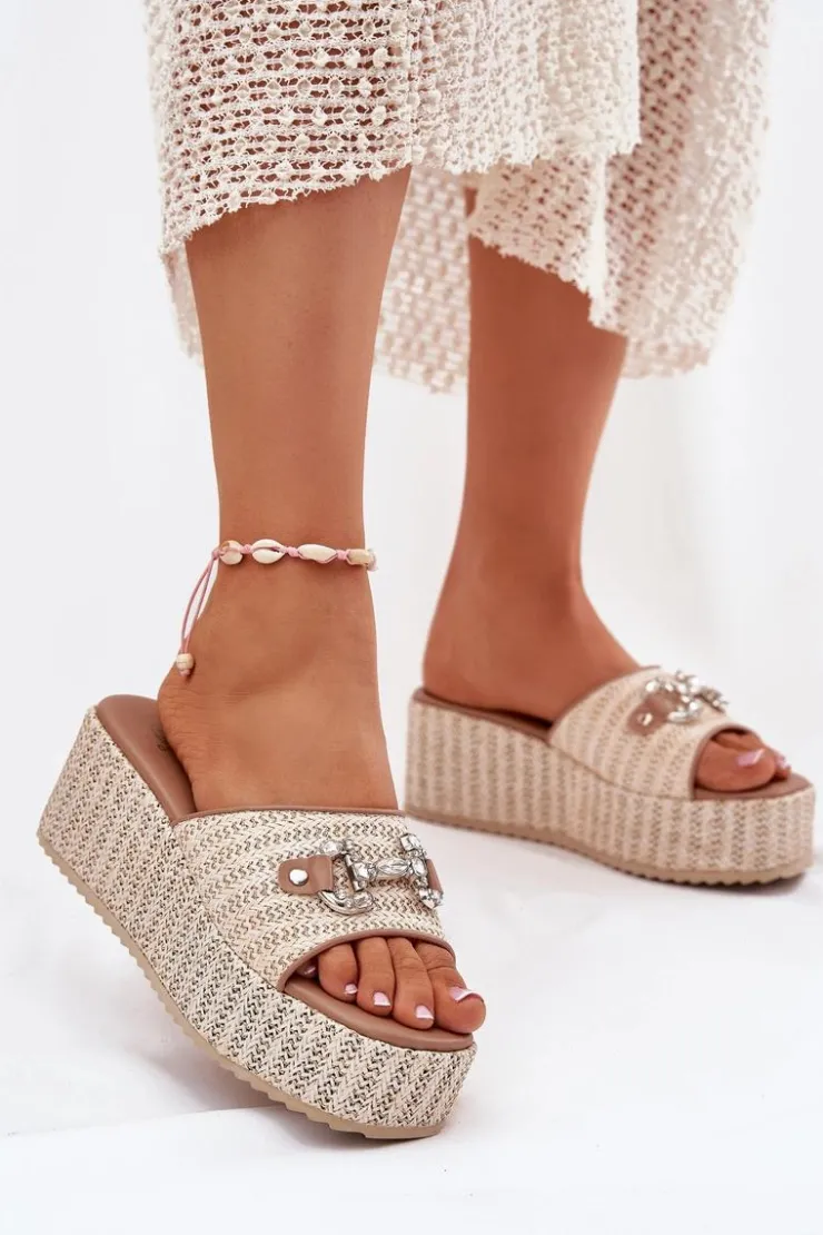 Klapki damskie z plecionką, osadzone na koturnie i platformie, to stylowa propozycja na letnie dni. Na pasku znajduje się subtelny ozdobny detal, który nadaje im wyjątkowego charakteru. Miękka wkładka zapewnia komfort noszenia przez cały dzień, a połączenie koturny i platformy gwarantuje wygodę i stabilność. Idealne do codziennych stylizacji. Przy wyborze rozmiaru prosimy kierować się tabelą rozmiarów.