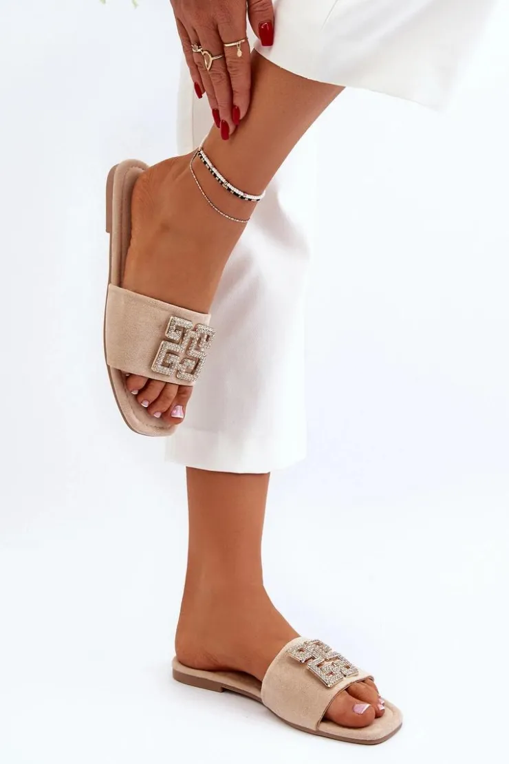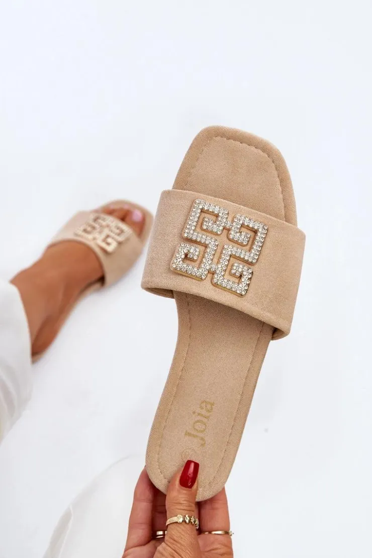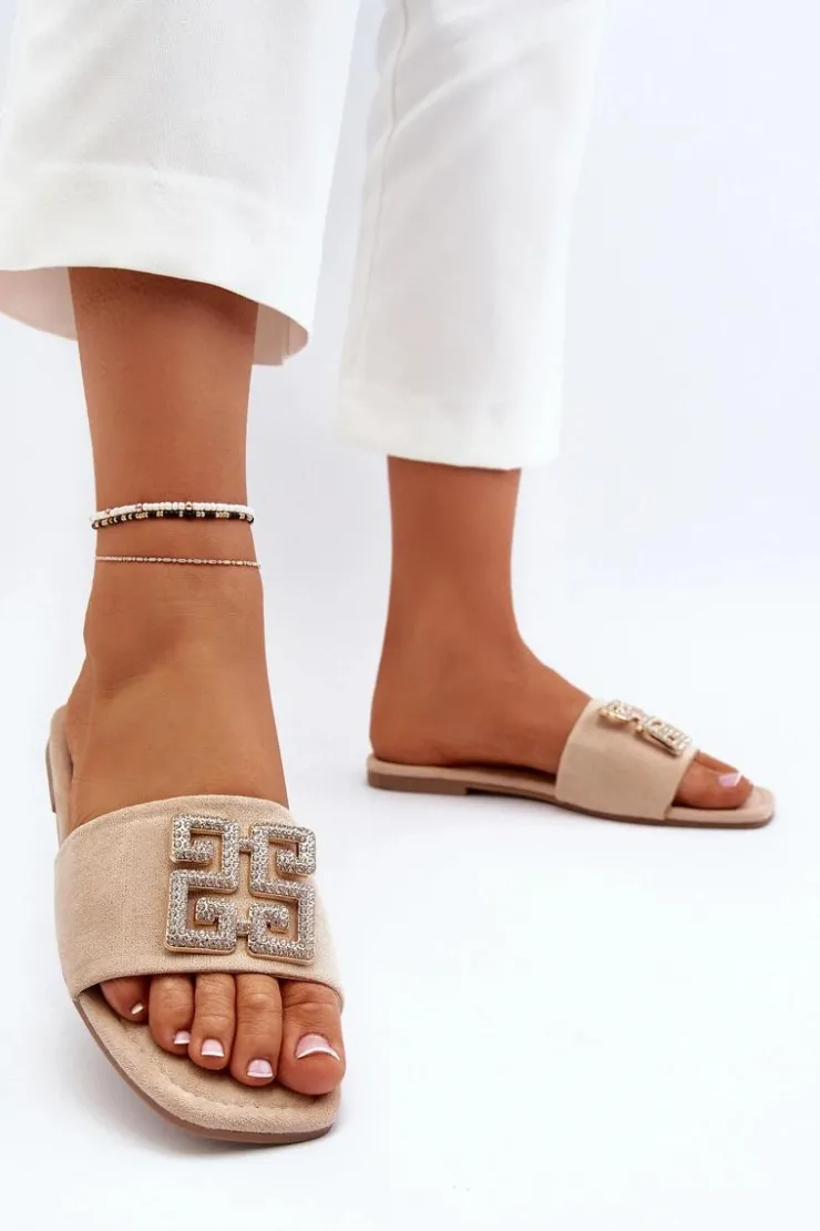 Klapki damskie osadzone na płaskim obcasie zapewniają wygodę noszenia przez cały dzień. Ozdoba z błyszczącymi cyrkoniami umieszczona z przodu dodaje im subtelnego blasku. Ten fason z pewnością podkreśli wyjątkowy charakter Twojej letniej stylizacji. Przy wyborze rozmiaru prosimy sugerować się tabelą rozmiarów.