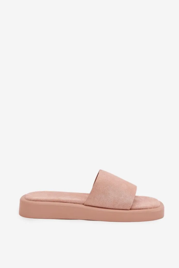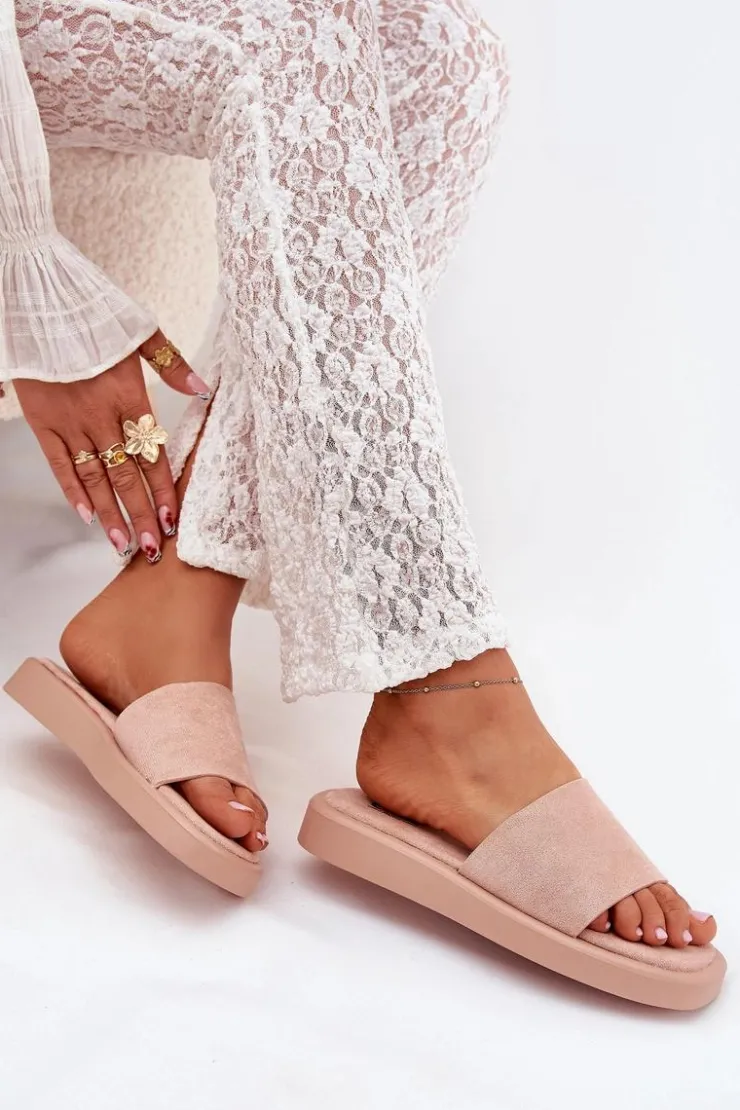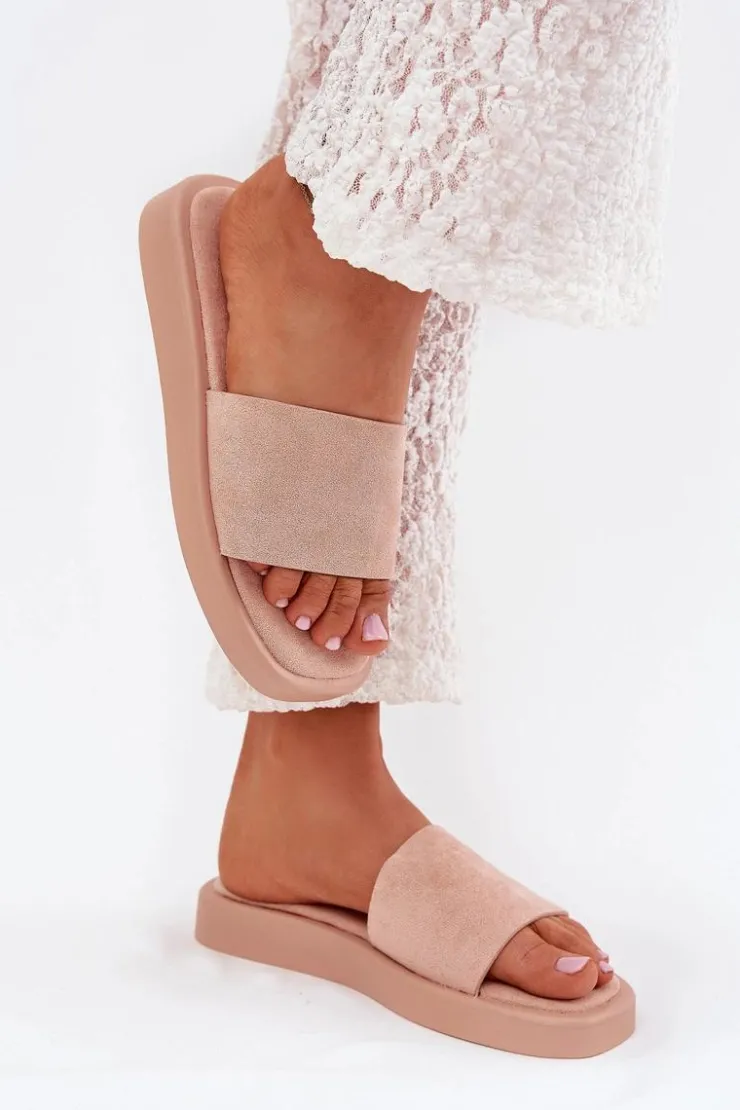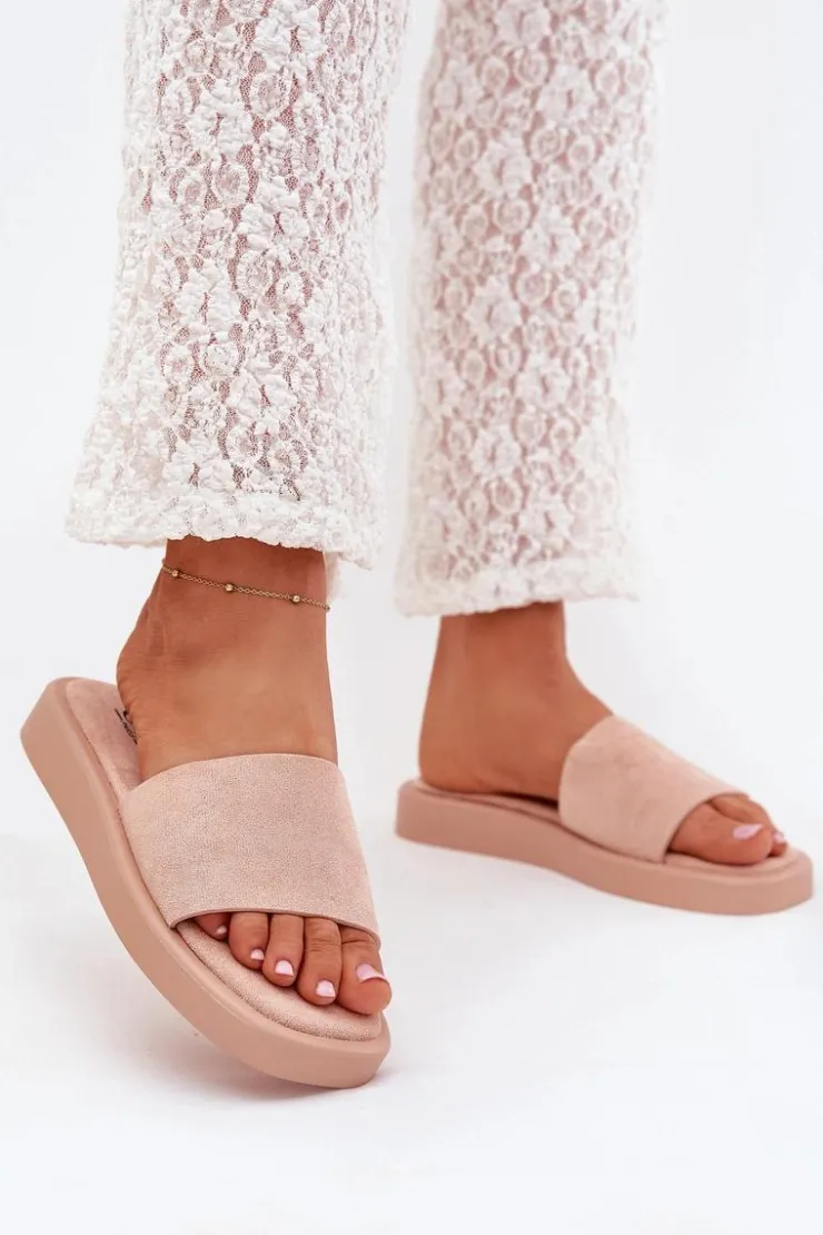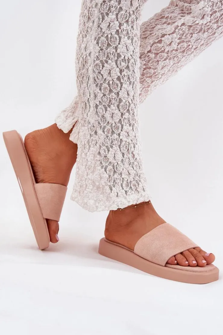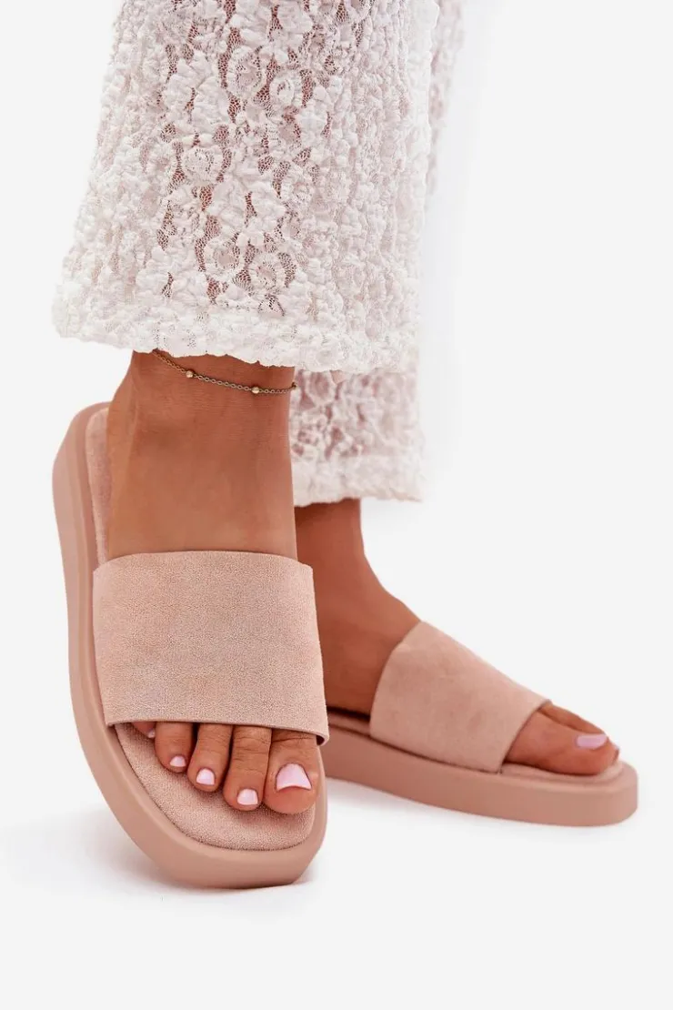 Klasyczne klapki damskie z eko zamszu, osadzone na platformie, łączą wygodę z prostym stylem. Idealne do casualowych stylizacji, doskonale komponują się z sukienkami, spódnicami czy spodniami, zapewniając komfort i elegancki wygląd na co dzień. Przy wyborze rozmiaru prosimy sugerować się tabelą rozmiarów.
