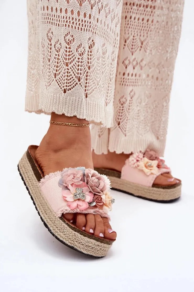 Te damskie klapki ozdobione uroczymi materiałowymi kwiatami i przypinką w formie misia to świetna opcja, która doda unikalnego akcentu do każdej stylizacji. Osadzone na platformie platformie z jutową plecionką, łączą komfort z modnym wyglądem. Dzięki profilowanej eko zamszowej wkładce zapewniają wygodę przez cały dzień. Ten model z pewnością przyciągnie spojrzenia i sprawi, że wyróżnisz się w tłumie! Przy wyborze rozmiaru prosimy sugerować się tabelą rozmiarów.