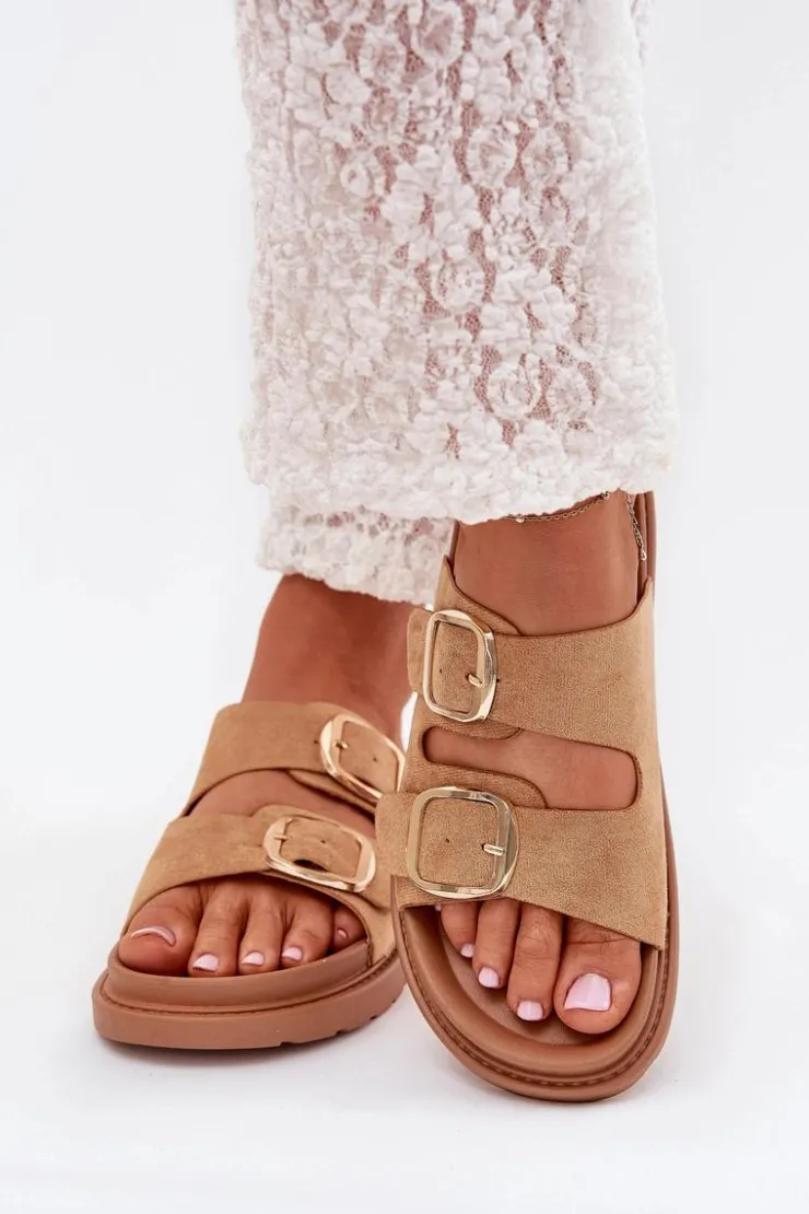 Klapki damskie wykonane z eko zamszu. Osadzone na platformie. Dwa regulowane paski ze złotymi klamrami zapewniają idealne dopasowanie, a profilowana wkładka gwarantuje komfort przez cały dzień. Idealne na codzienne wyjścia. Przy wyborze rozmiaru rosimy sugerować się tabelą rozmiarów.