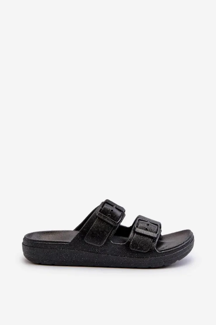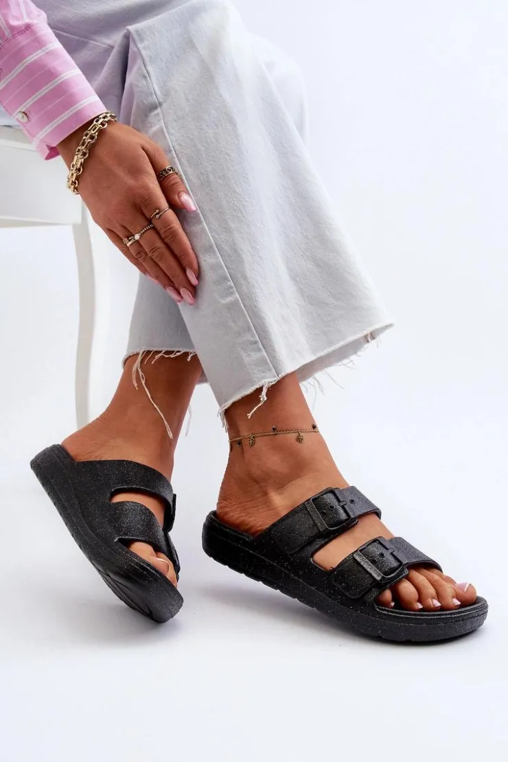 Klapki damskie, które z pewnością przyciągną spojrzenia dzięki efektownemu wykończeniu brokatem. Z przodu klamry, nie tylko zapewniają stylowy wygląd, ale także umożliwiają łatwe dopasowanie do stopy. Idealne na letnie, wieczorne wyjścia czy inne okazje, gdzie chcesz dodać trochę blasku i elegancji do swojej stylizacji. Przy wyborze rozmiaru prosimy sugerować się tabelą rozmiarów.