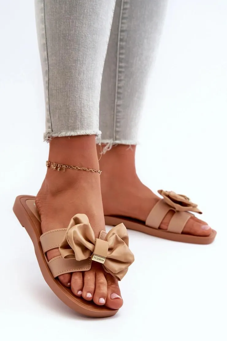 Klapki damskie wykonane z gumowego tworzywa. Eko Skórzana kokarda nadaje im dziewczęcy i urokliwy wygląd. Klapki są wygodne w użytkowaniu, a także elastyczne. Idealne na letnie spacery, wypad na plażę czy spotkania ze znajomymi. Przy wyborze rozmiaru prosimy sugerować się tabelą rozmiarów.