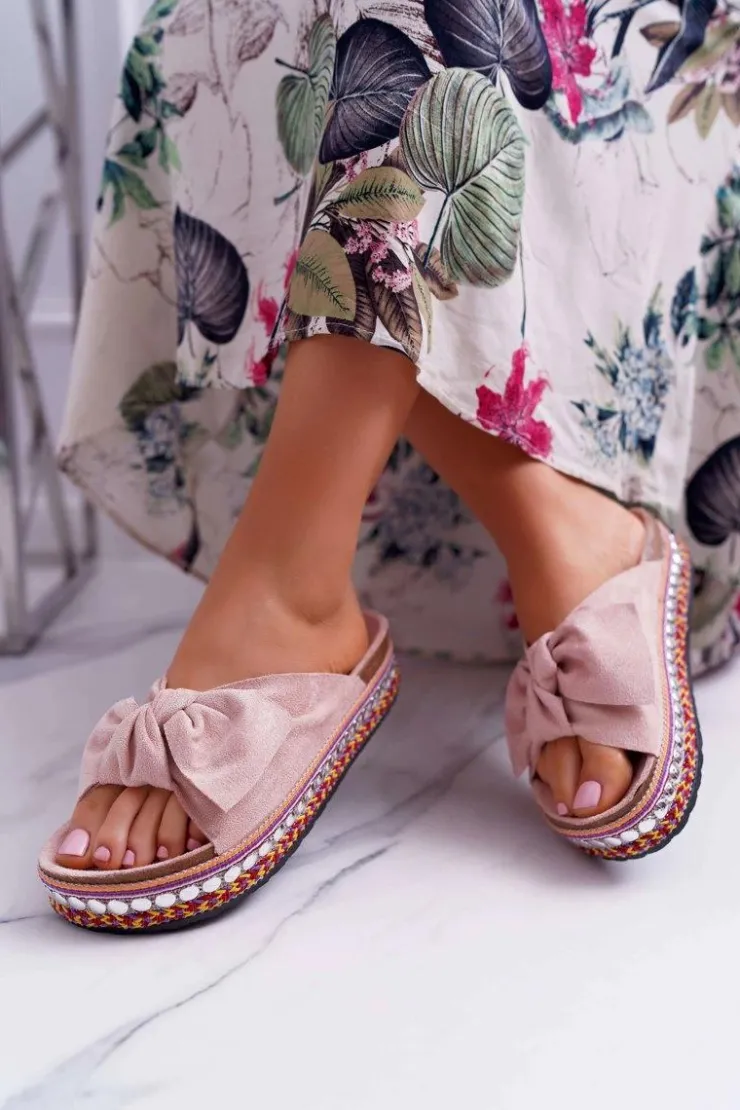 Damskie Boto Klapki Damskie Z Kokardami Gruba Podeszwa Różowe Milady
