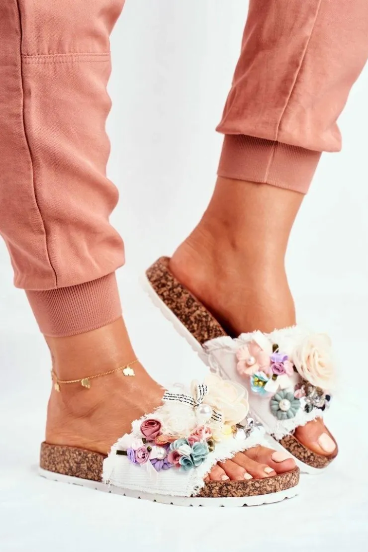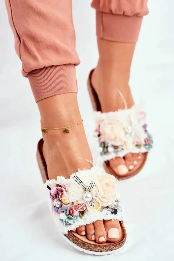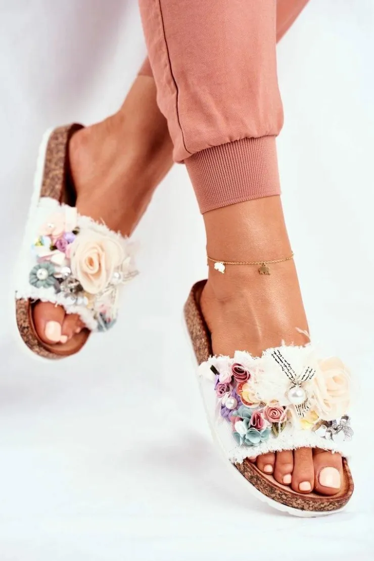 Damskie Boto Klapki Damskie Z Kwiatami Białe Enrissa