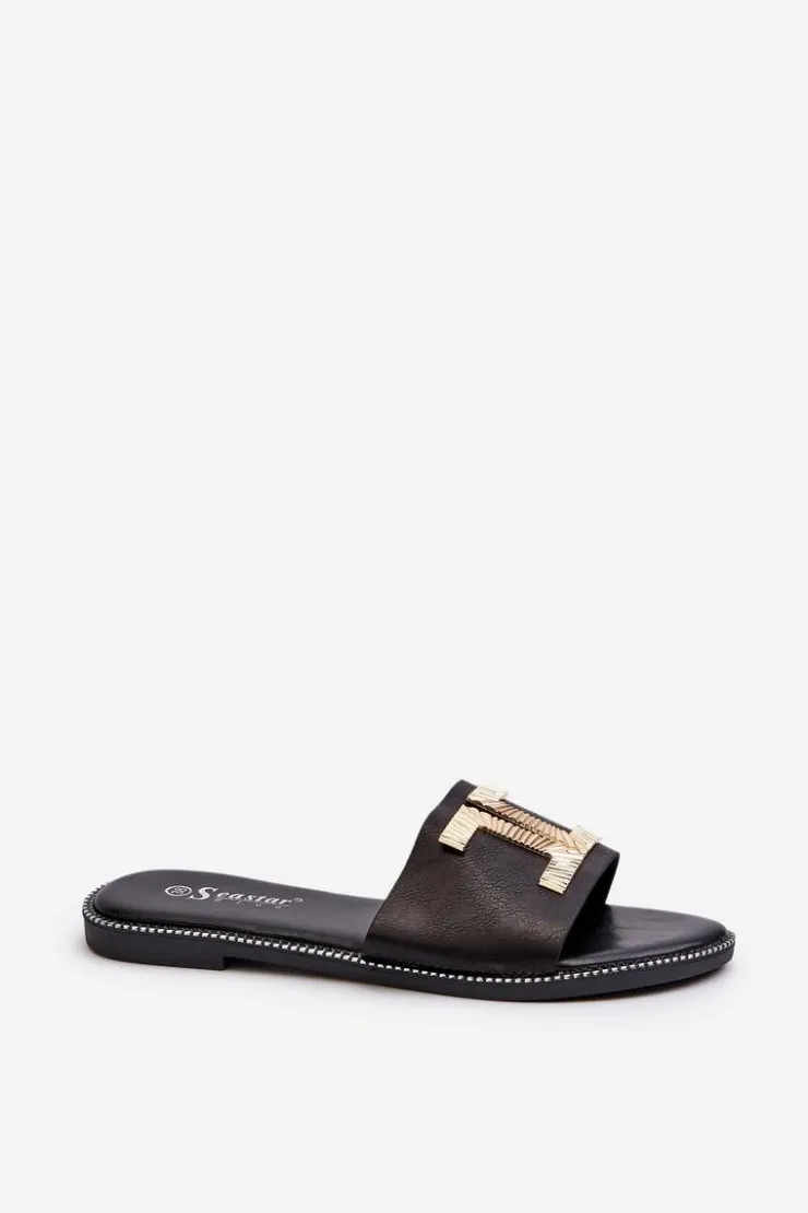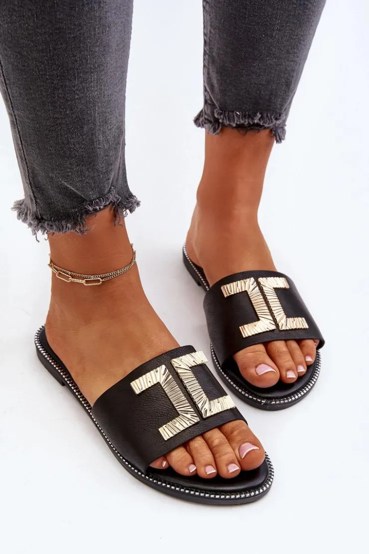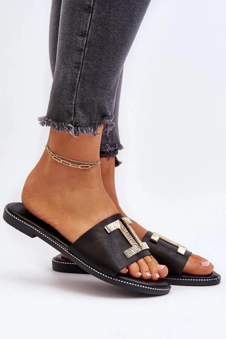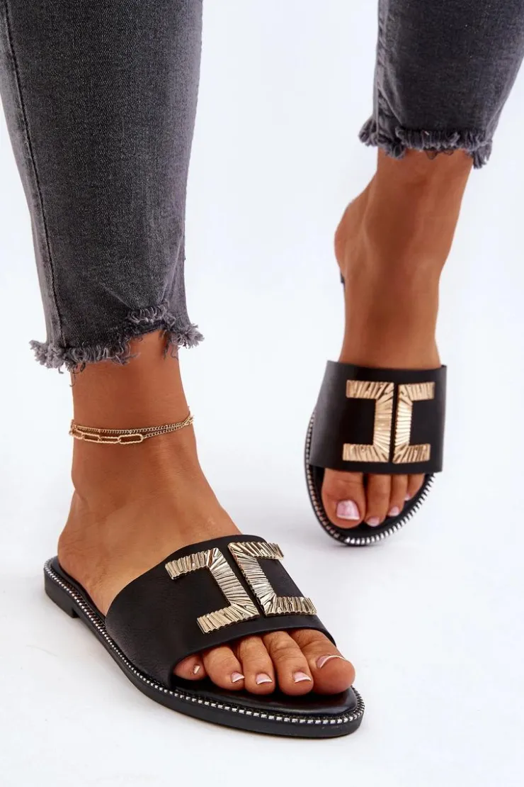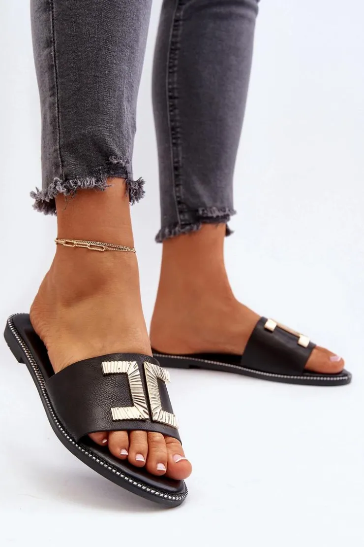 Klapki damskie na płaski obcasie, który gwarantuje stabilność i wygodę podczas noszenia. Na przodzie złota ozdoba, która dodaje im elegancji i subtelności. Model ten doskonale uzupełni letnie stylizacje! Przy wyborze rozmiaru prosimy sugerować się tabelą rozmiarów.