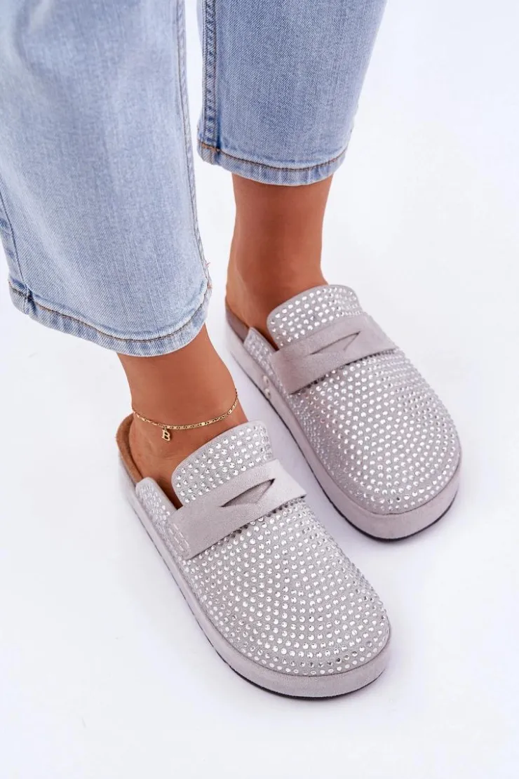 Klapki damskie z eko zamszu. Osadzone na platformie. Model ten wyróżnia się licznymi cyrkoniami, które nadają blasku każdej stylizacji. Noski zakryte, zaokrąglone. Lekko profilowana wkładka zapewni wygodę. Stylowy fason, który z pewnością dopełni wiele letnich stylizacji! Przy wyborze rozmiaru prosimy sugerować się tabelą rozmiarów.