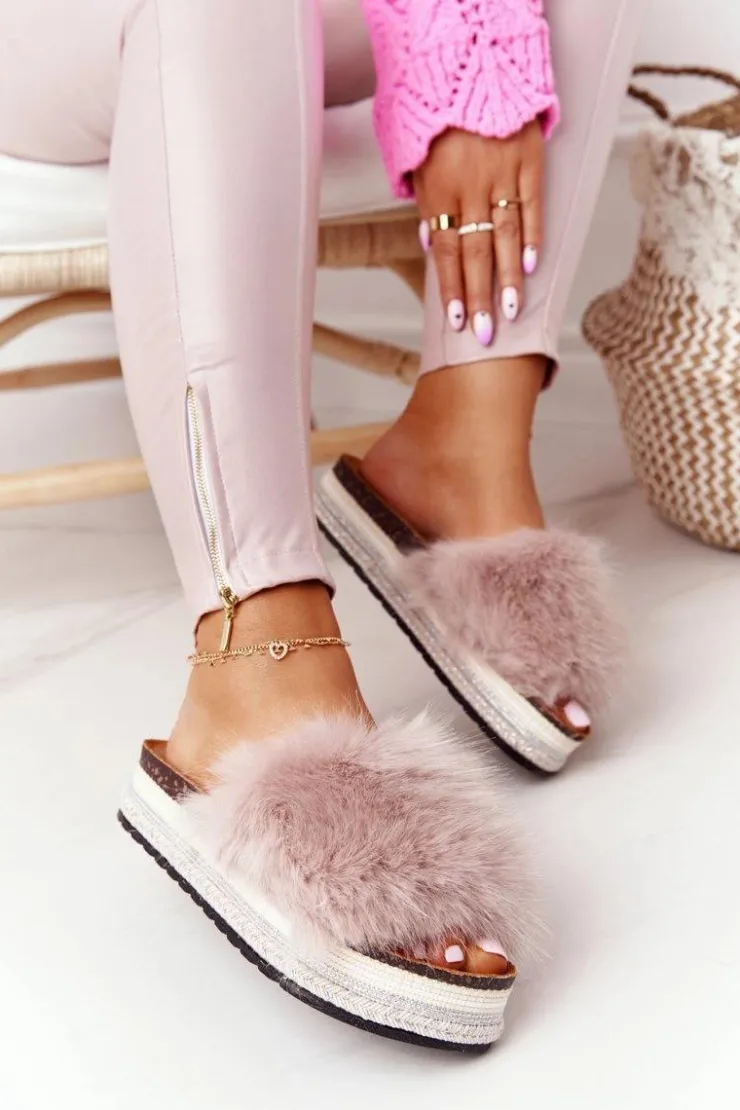 Damskie Boto Klapki Na Platformie z Futerkiem Beżowe Adventure