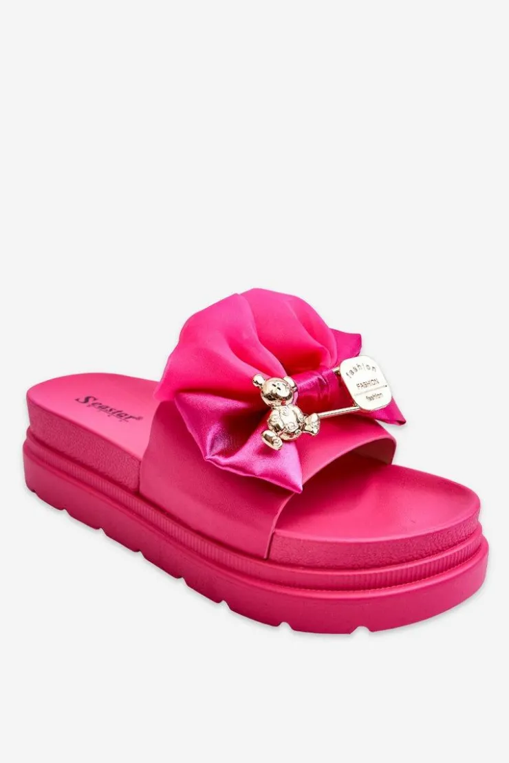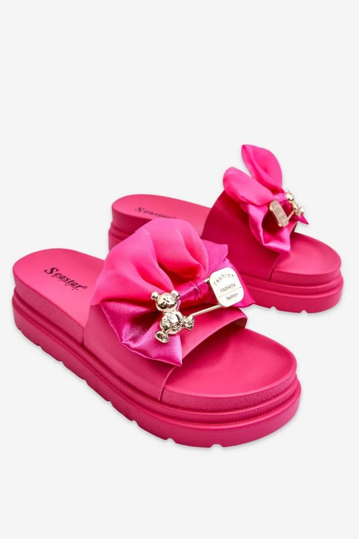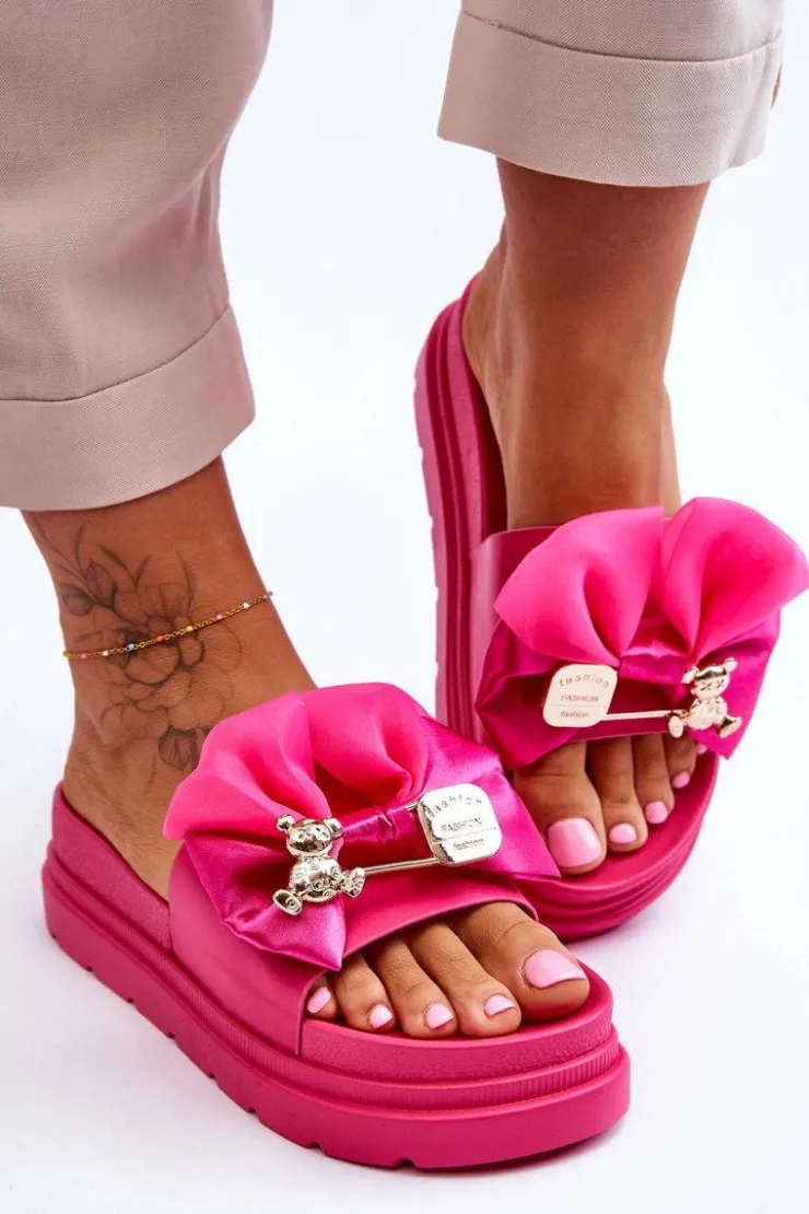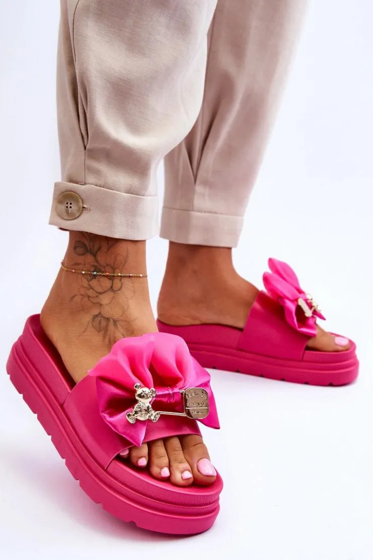 Cudowne, damskie klapki wykonane z eko skóry. Model ten posiada materiałową kokardę i imitację agrafki z misiem i blaszką z napisem. Osadzone na masywnej platformie. Wkładka została wykonana z tworzywa sztucznego. Idealne klapki na nadchodzący sezon! Koniecznie powinnaś je mieć! Przy wyborze rozmiaru prosimy sugerować się tabelą rozmiarów.