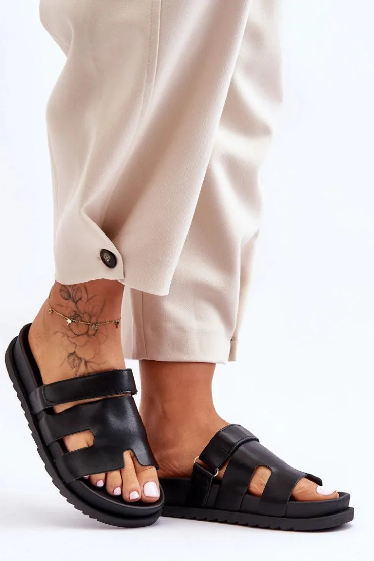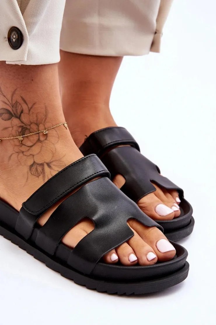 Klasyczne klapki damskie na lekkiej platformie zostały wzbogacone zapięciem na rzep, dzięki któremu obuwie można dopasować do tęgości nogi. Dobrze wyprofilowana wkładka zapewni komfort podczas użytkowania. Klapki te o ciekawym fasonie z pewnością sprawdzą się w wielu stylizacjach! Zostały wykonane z eko skóry. Przy wyborze rozmiaru prosimy sugerować się tabelą rozmiarów.