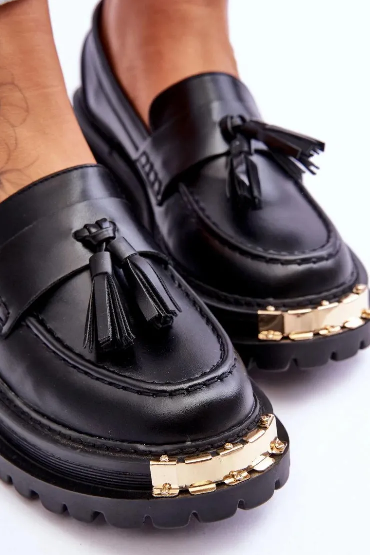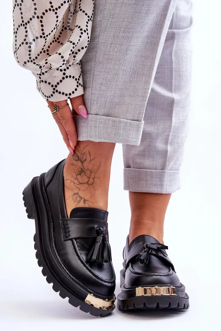 Klasyczne półbuty — mokasyny zostały wykonane z ekologicznej skóry. Na przodzie platformy posiadają ozdobne elementy, natomiast na środku obuwia zostały umieszczone frędzle. Mokasyny osadzono na płaskim obcasie i platformie. Model ten posiada delikatnie usztywniany zapiętek. Niezwykle stabilny fason, który powinien być Twój! Przy wyborze rozmiaru prosimy sugerować się tabelą rozmiarów.