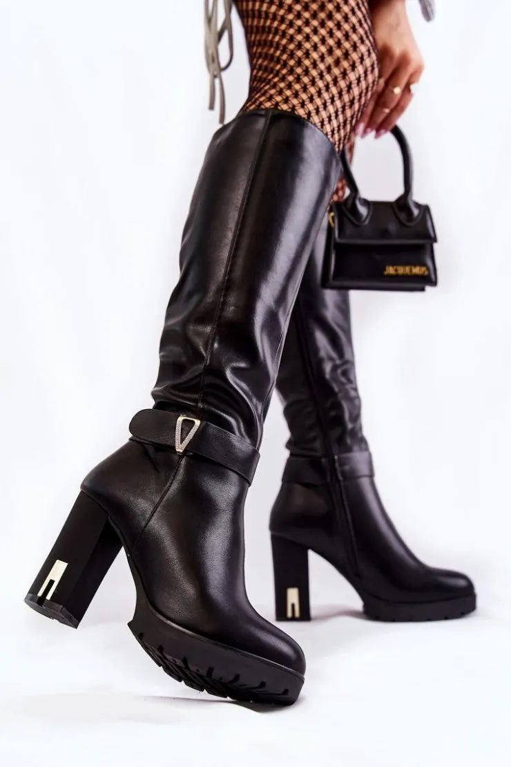 Kozaki damskie osadzone na zdobionym obcasie oraz platformie świetnie sprawdzą się w sezonie jesiennym! Wykonane z eko skóry. Posiadają pasek z ozdobą z imitacją cyrkonii. Kozaki zapinane na suwak. Posiadają w środku ocieplenie w postaci koca obuwniczego. Modny fason, który sprawdzi się w wielu stylizacjach! Przy wyborze rozmiaru prosimy sugerować się tabelą rozmiarów.