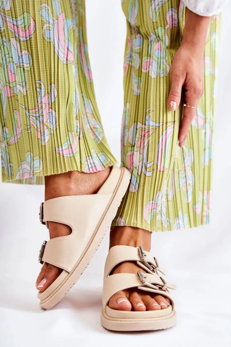 Klasyczne klapki wsuwane wykonane z eko skóry. Osadzone na płaskiej, grubszej podeszwie. Posiadają z przodu dwa regulowane paski ze sprzączką. Wygodna, profilowana wkładka z gumowego tworzywa. Idealne na co dzień! Model z odkrytym, zaokrąglonym noskiem. Świetne obuwie na lato! Przy wyborze rozmiaru prosimy sugerować się tabelą rozmiarów.