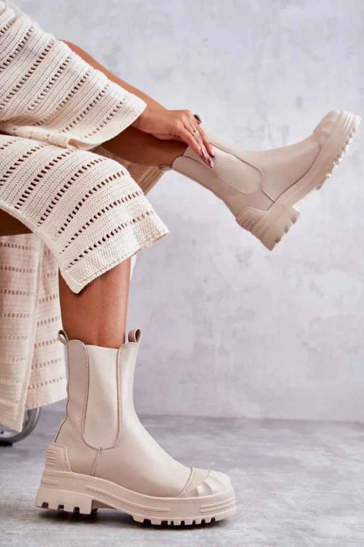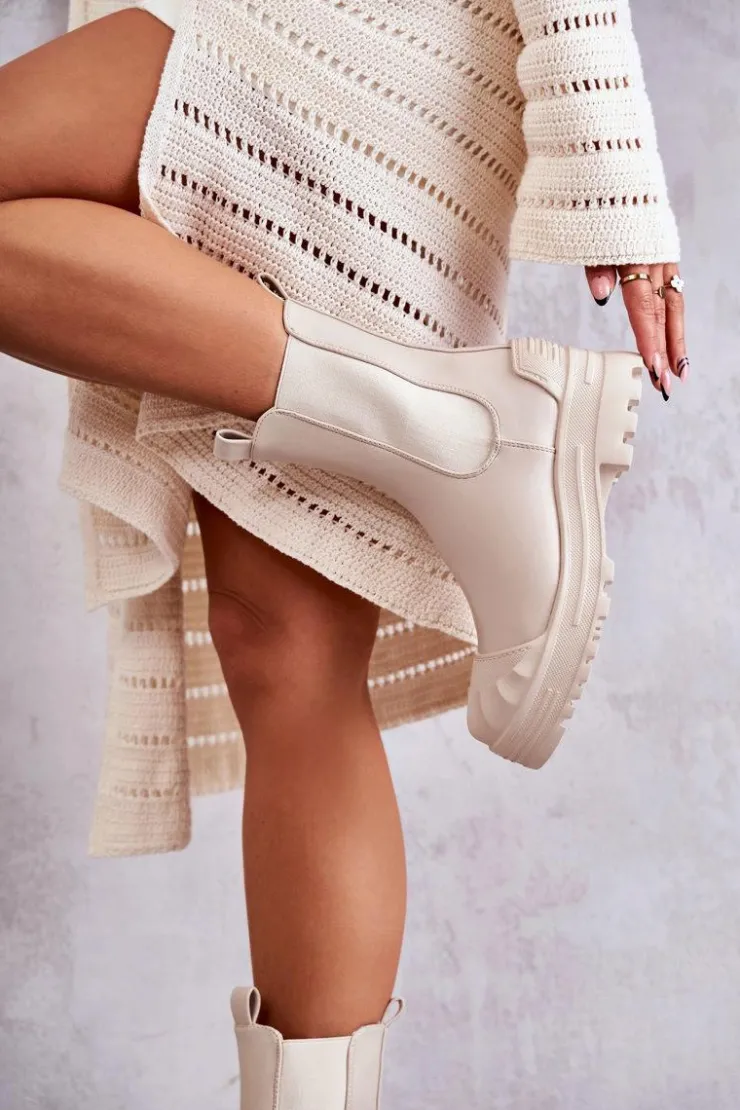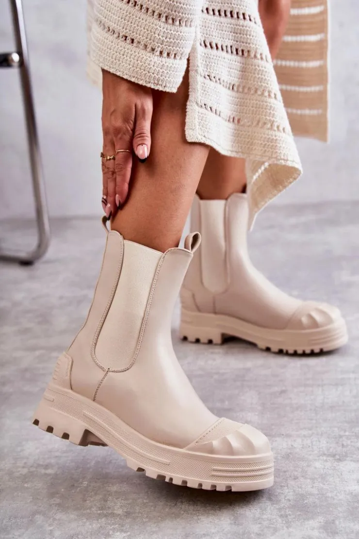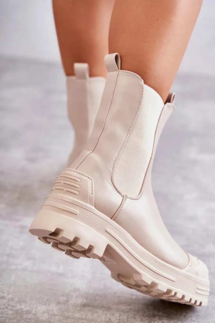 Niezwykłe i stylowe botki damskie zostały wykonane z eko skóry. Model wsuwany. Zapiętek został usztywniony. Na okrągłym nosku znajduje się charakterystyczne wzmocnienie z tworzywa sztucznego. Botki osadzone są na platformie oraz płaskim obcasie. Wkładka materiałowa. Dodatkowo u góry cholewki znajdują się pętelki ułatwiające zakładanie obuwia. Przy wyborze rozmiaru prosimy sugerować się tabelą rozmiarów.