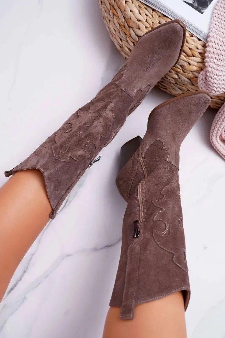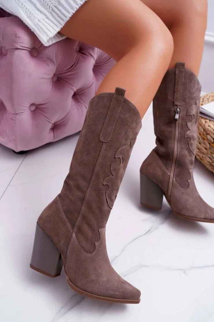 Damskie Boto Kozaki Damskie Na Słupku Kowbojki Cappuccino Brunt