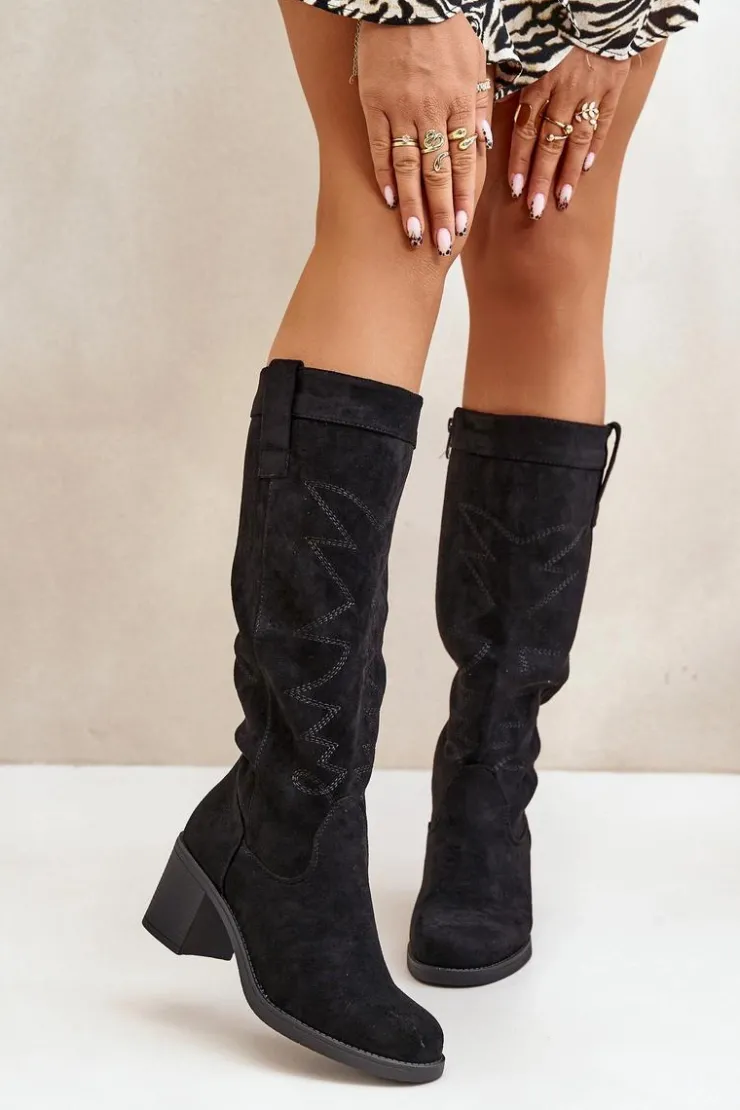 Damskie kozaki przed kolano wykonane z eko zamszu. Osadzone na obcasie w postaci niskiego słupka. Noski zaokrąglone. Cholewka ozdobiona przeszyciami. Model zapinany na zamek. Świetne do jesiennych stylizacji! Przy wyborze rozmiaru prosimy sugerować się tabelą rozmiarów.