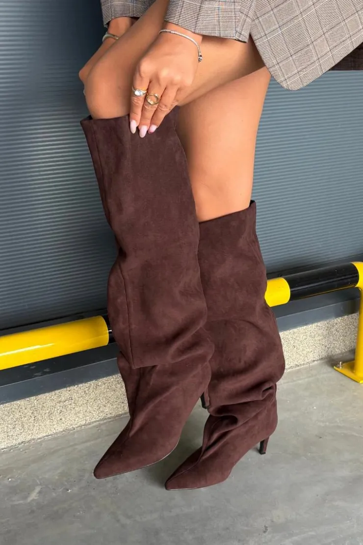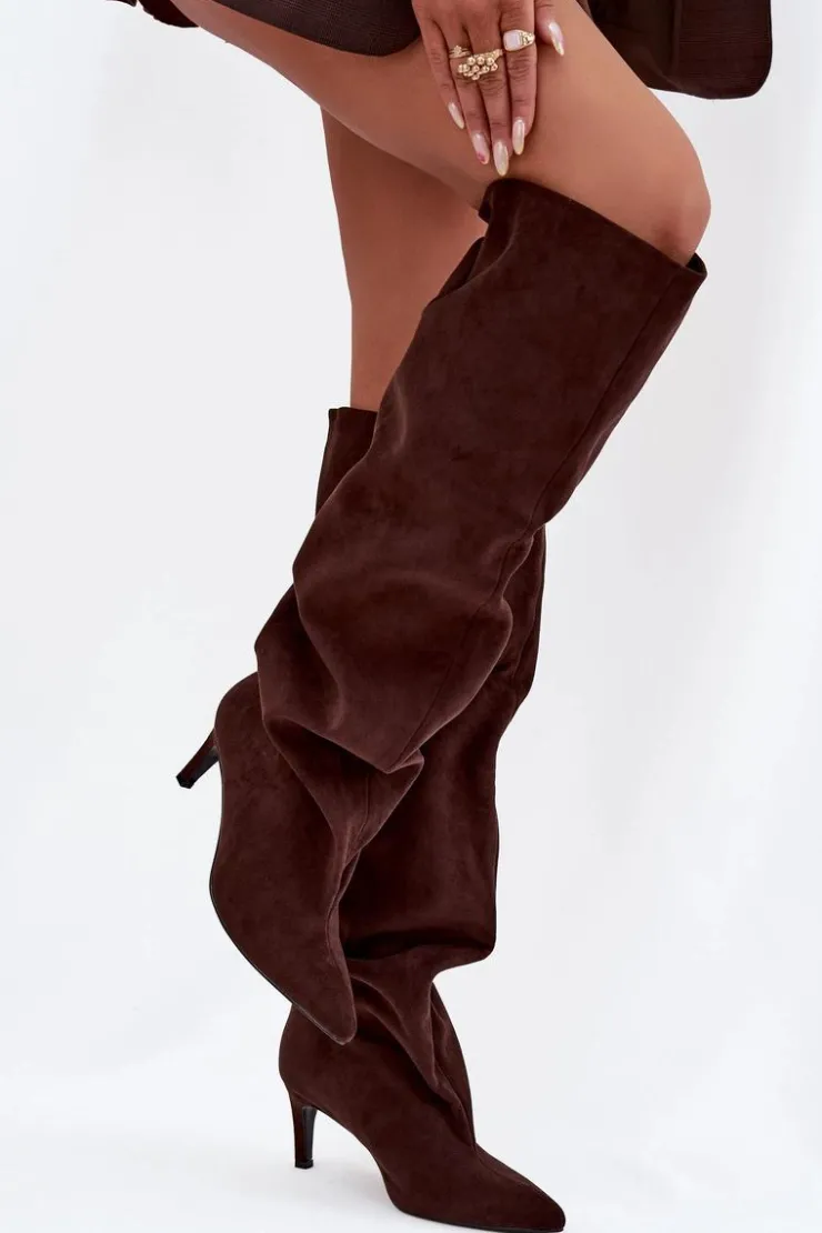 Kozaki Mavilla to propozycja dla kobiet, które cenią sobie elegancję i klasykę w nowoczesnym wydaniu. Wykonane z miękkiego eko zamszu w ciepłym czekoladowym odcieniu, prezentują się niezwykle stylowo i kobieco. Wysoka cholewka sięgająca za kolano pięknie wydłuża nogi, a smukła linia buta subtelnie podkreśla sylwetkę. To model, który doskonale łączy modny wygląd z wygodą użytkowania.