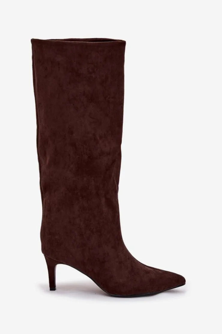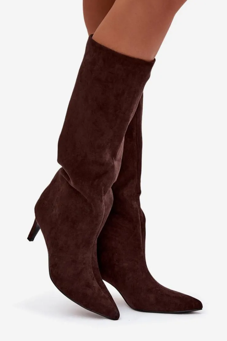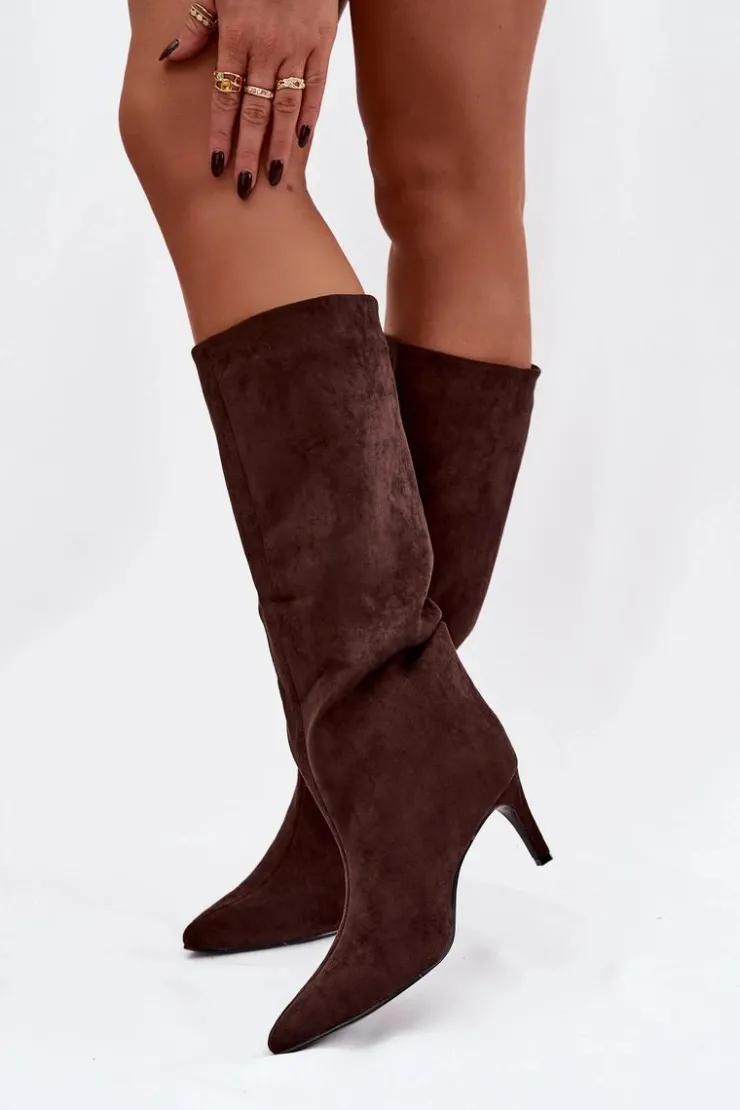 Kozaki damskie wsuwane ocieplane na szpilce czekoladowe Olivienne