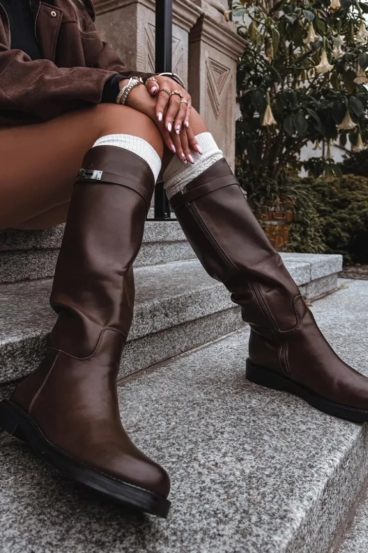 Kozaki damskie wykonane z eko skóry to stylowa i praktyczna propozycja na chłodniejsze dni. Model osadzony na płaskim obcasie zapewnia wygodę podczas codziennego noszenia, a zapięcie na zamek ułatwia zakładanie i zdejmowanie. Zaokrąglone noski podkreślają klasyczny charakter obuwia, dzięki czemu kozaki doskonale komponują się z wieloma stylizacjami. Wnętrze ocieplone wyłącznie na wysokości stopy gwarantuje komfort i ciepło bez nadmiernego przegrzewania. U góry cholewki znajduje się ozdobny pasek z eleganckim detalem, który dodaje całości subtelnego uroku. To model, który świetnie sprawdzi się w zestawieniu z sukienkami, spódnicami, legginsami czy dopasowanymi jeansami typu skinny, tworząc kobiecy i stylowy look idealny na sezon jesienno-zimowy. Przy wyborze rozmiaru prosimy sugerować się tabelą rozmiarów.