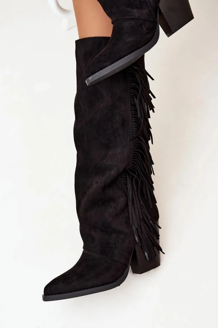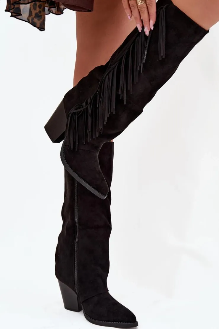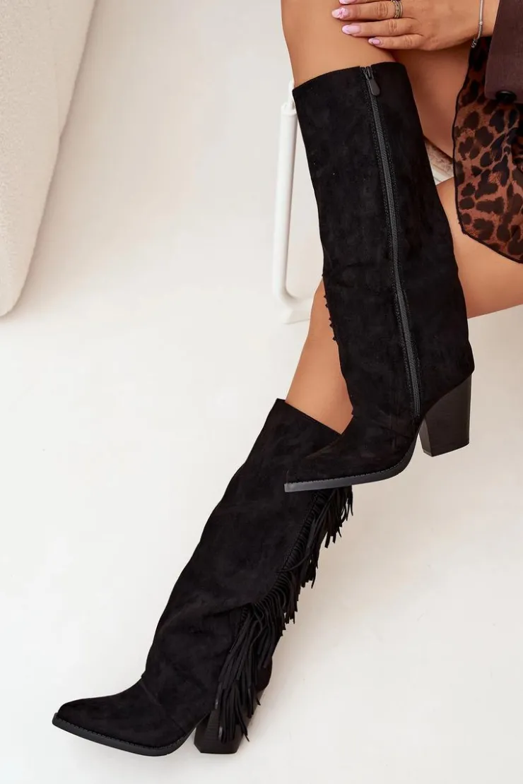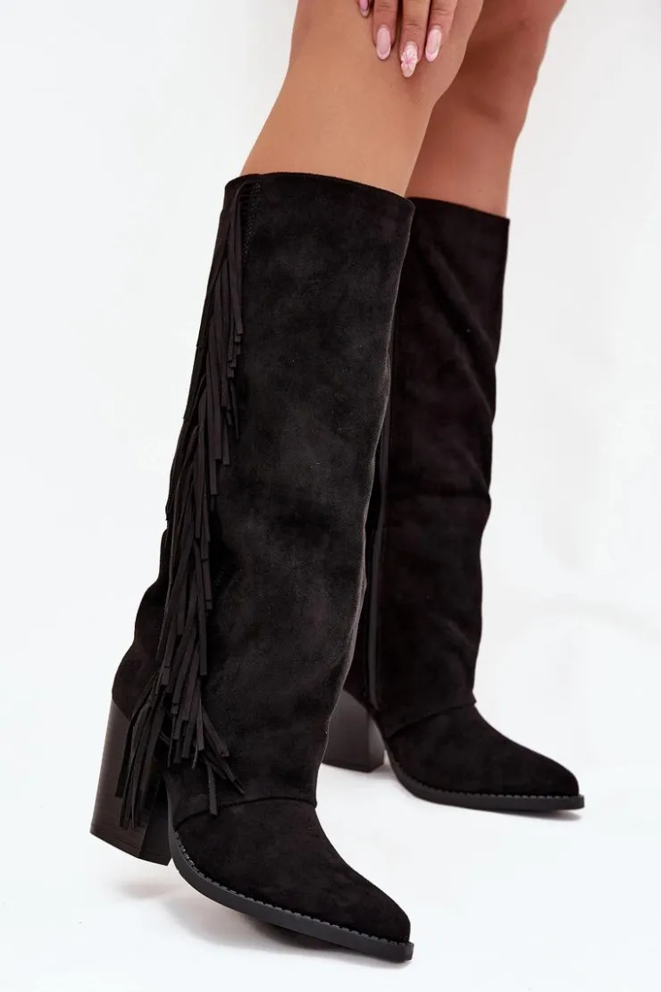Frędzle na cholewce: Modne wykończenie w postaci frędzli nadaje butom kowbojskiego charakteru, przyciągając wzrok i dodając lekkości każdej stylizacji.
