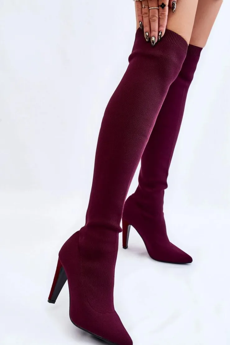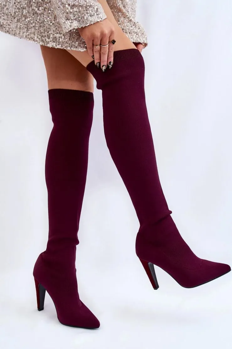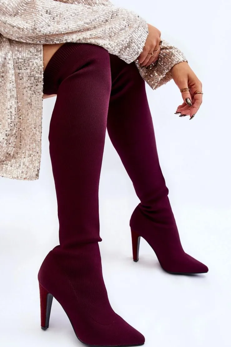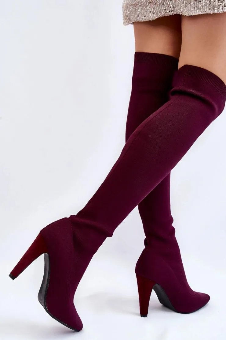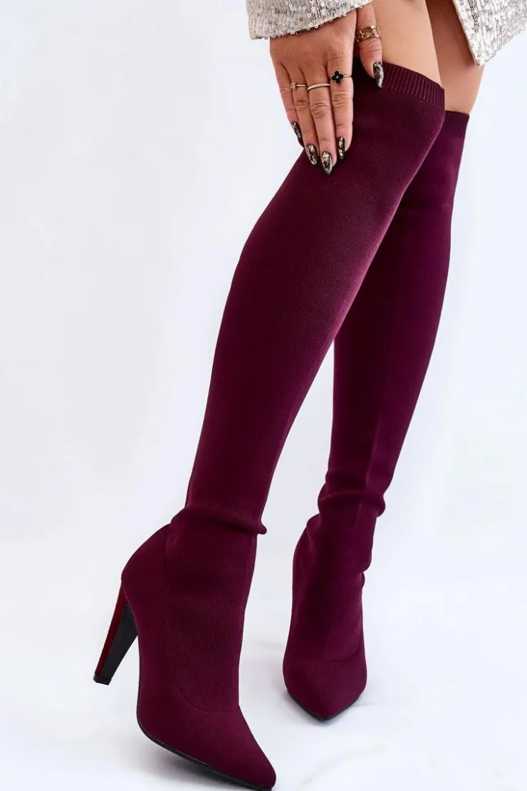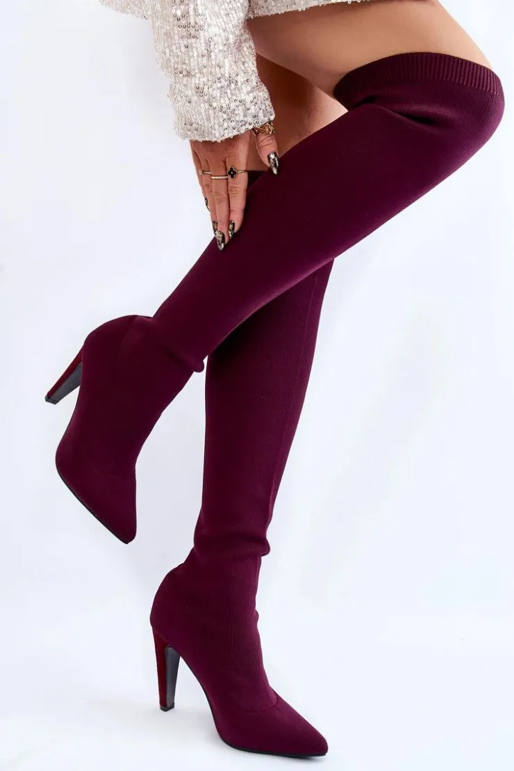 Wysokie kozaki za kolano są wykonane z elastycznego materiału tekstylnego, dzięki temu cholewka dopasuje się do tęgości nogi. U góry cholewki znajduje się ściągacz. Nosek w szpic. Obcas pokryty jest eko zamszem. Wkładka jest wykonana z eko skóry. Kozaki te świetnie będą się prezentować wraz z sukienkami czy spódniczkami. Przy wyborze rozmiaru prosimy sugerować się tabelą rozmiarów.