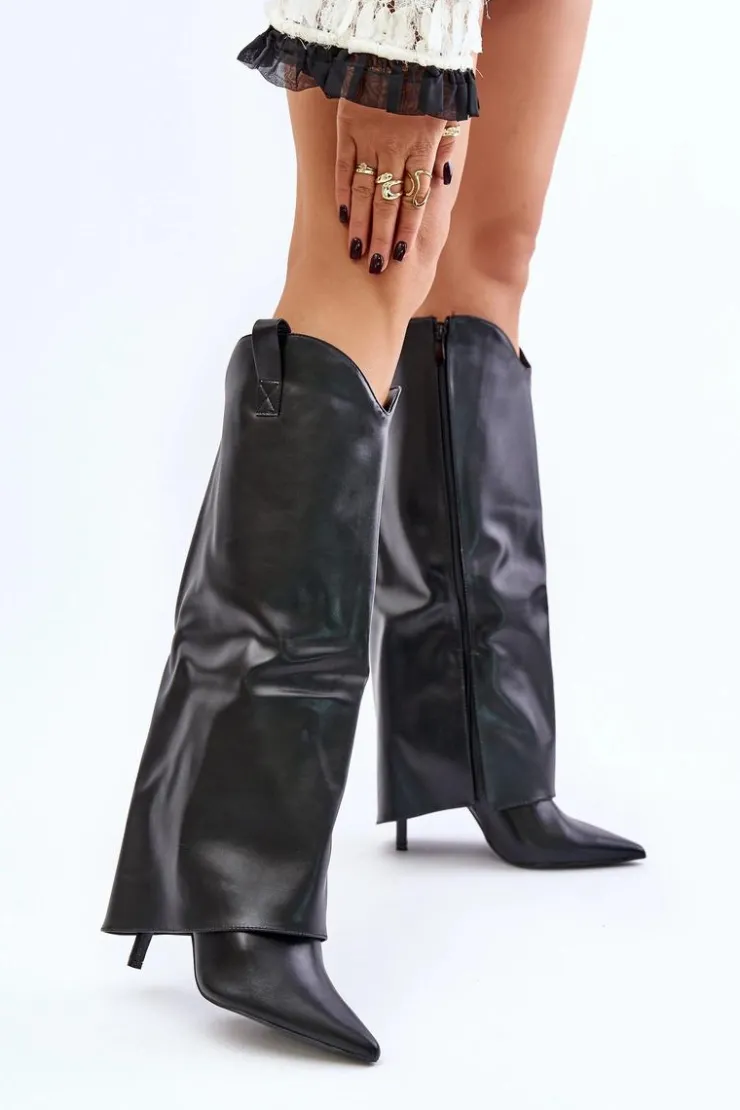 Kozaki wykonane z eko skóry, wyróżniają się wywiniętą cholewką, która efektownie zachodzi na obcas. Model posiada noski w szpic, dodające mu szyku, a zamek po boku ułatwia zakładanie i zdejmowanie butów. Osadzone na smukłej szpilce, sięgają do kolana, podkreślając kobiecą sylwetkę. Idealne do eleganckich, jesienno-zimowych stylizacji! Przy wyborze rozmiaru prosimy sugerować się tabelą rozmiarów.