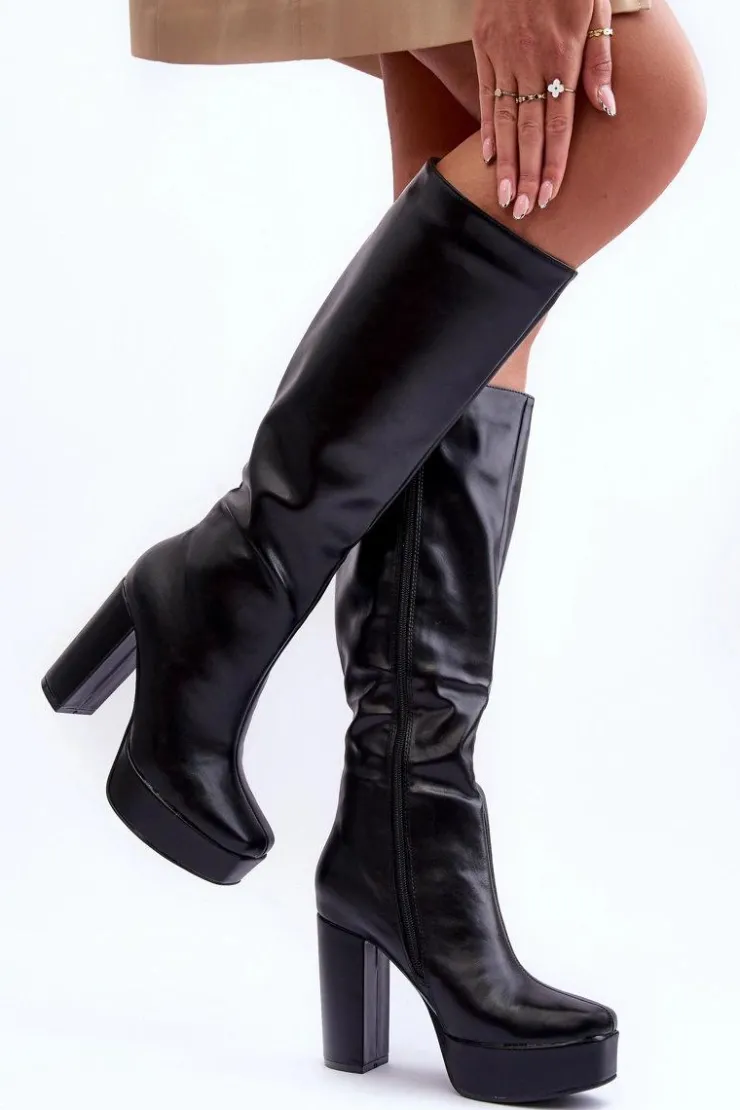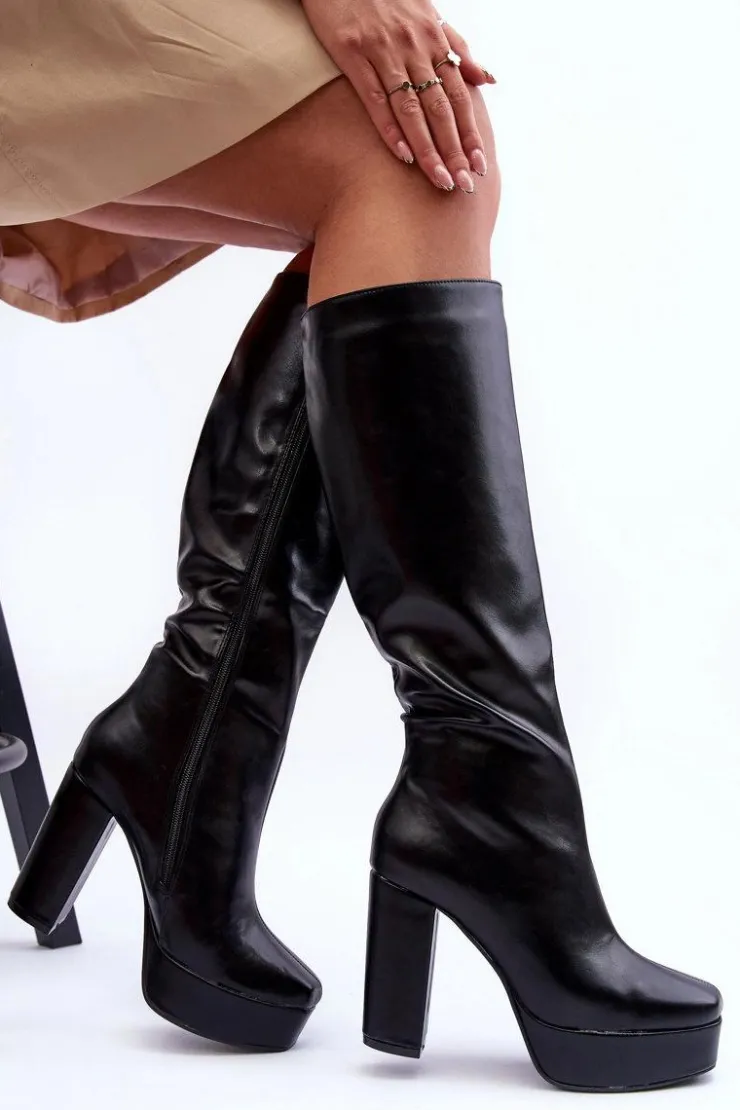 Modne kozaki damskie zostały wykonane z eko skóry. Osadzone na grubej platformie oraz obcasie w postaci masywnego słupka. Model zapinany na suwak. Cholewka przed kolano, noski kwadratowe. Świetny fason, który wyróżni Cię z tłumu. Nie posiadają ocieplenia. Koniecznie powinnaś je mieć! Przy wyborze rozmiaru prosimy sugerować się tabelą rozmiarów.