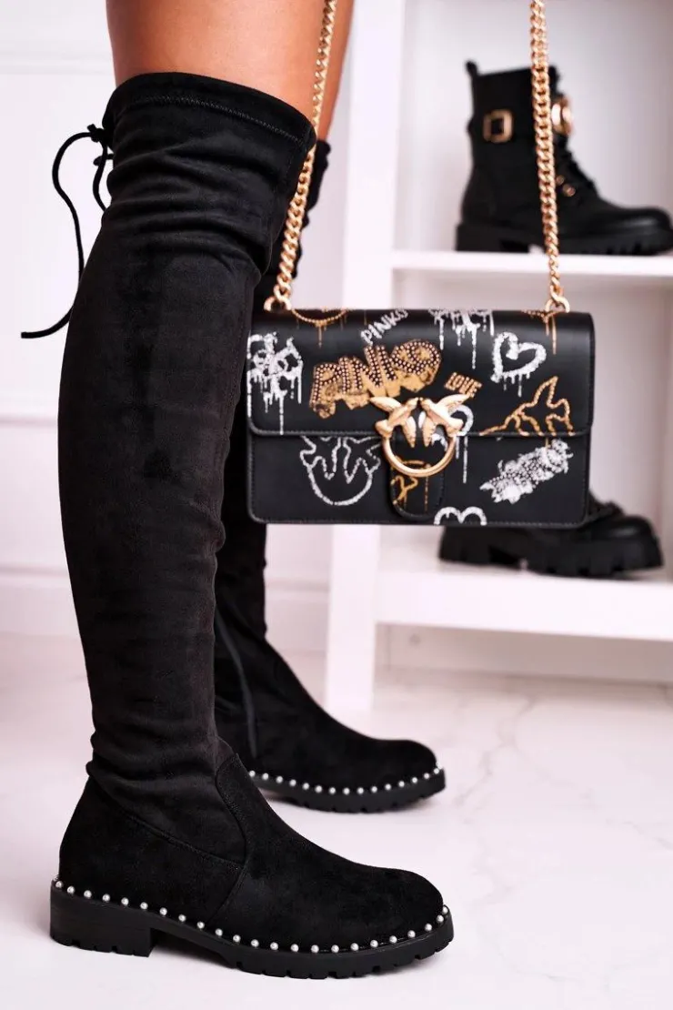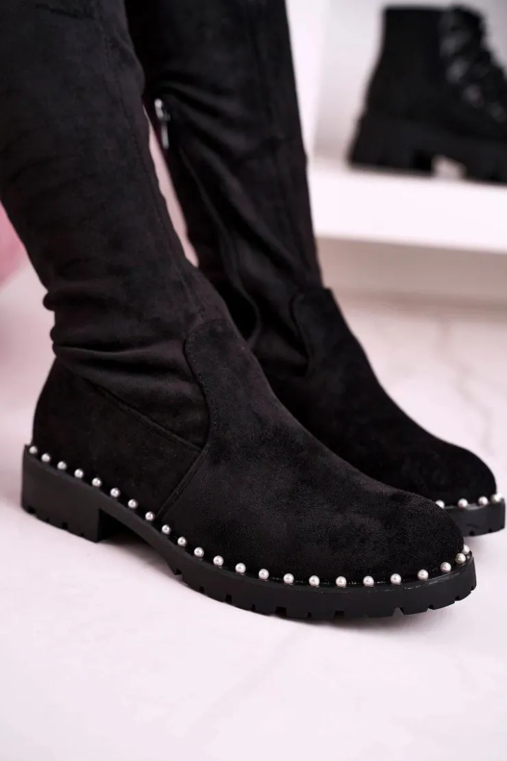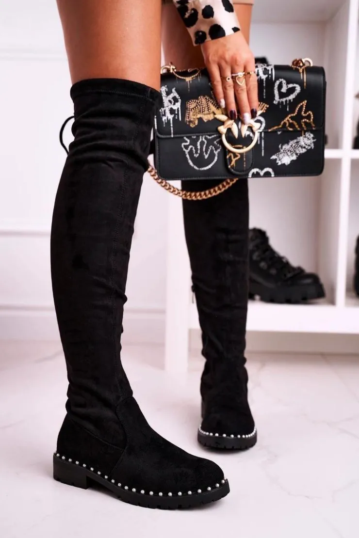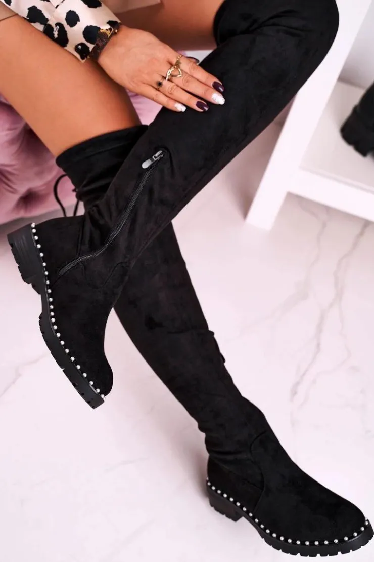Damskie Boto Kozaki Za Kolano Z Perełkami Zamszowe Czarne Isabel