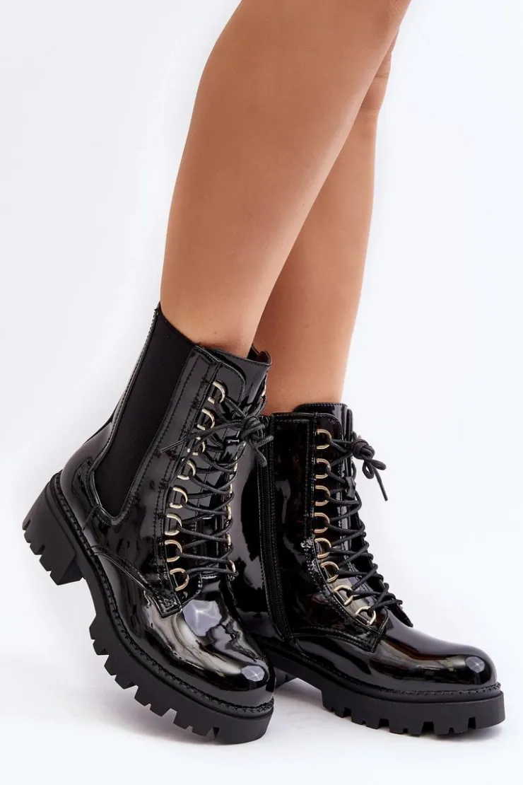 Damskie botki wykonane z eko skóry. Osadzone na płaskim obcasie. Na cholewce elastyczne wstawki. Noski zaokrąglone. Model ten zapinany jest na suwak z boku oraz dodatkowo posiada sznurowanie. Wnętrze ocieplone kocem obuwniczym. Świetny model do jesiennych i zimowych stylizacji! Przy wyborze rozmiaru prosimy sugerować się tabelą rozmiarów.