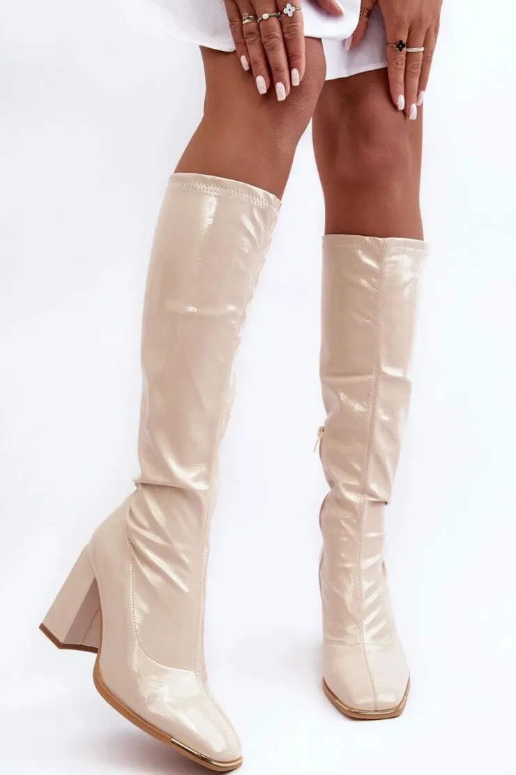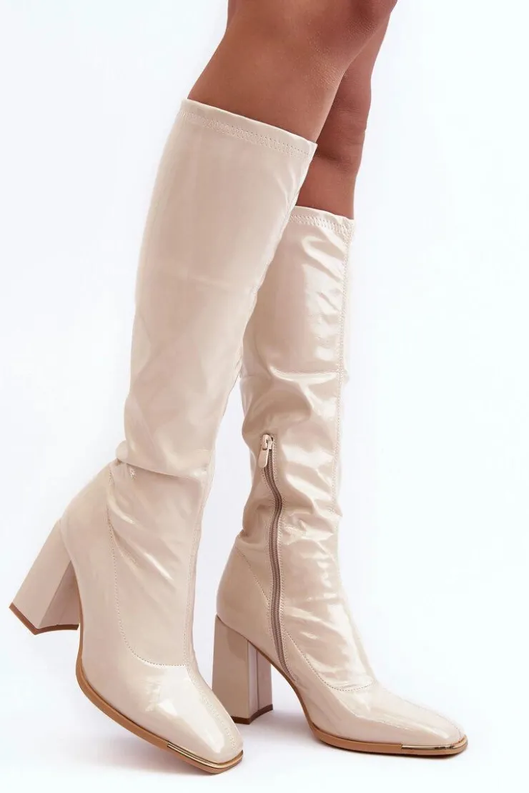 Kozaki damskie z cholewką przed kolano. Wykonane z eko skóry. Osadzone na obcasie w postaci słupka. Noski w kwadrat. Nieocieplane. Model wsuwany z dodatkowym suwakiem na dole cholewki. Idealny model zarówno do sukienek, jak i spodni! Przy wyborze rozmiaru prosimy sugerować się tabelą rozmiarów.