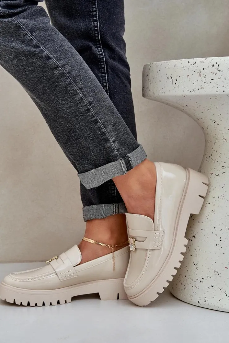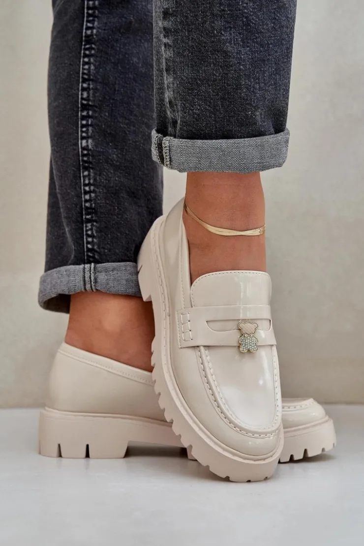 Damskie Boto Lakierowane Mokasyny Damskie Z Przypinką Miś Beżowe Wulinea